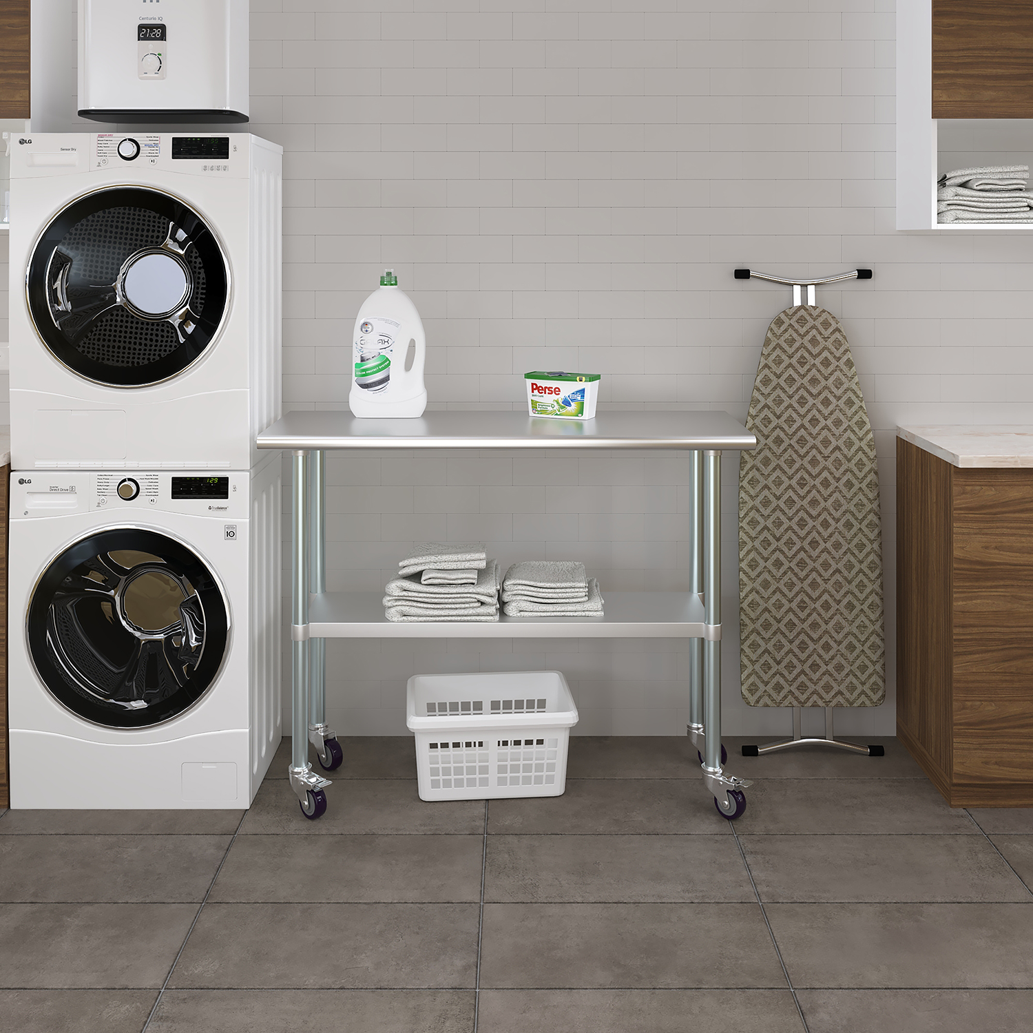 Upgrade your workspace with this versatile and practical work table that combines high functionality with contemporary design. Perfect for enhancing productivity and organization, the 18″ x 48″ Stainless Steel Work Table with Undershelf and Wheels is an indispensable asset for any professional setting, providing durability, convenience, and efficiency in a compact, mobile unit.
