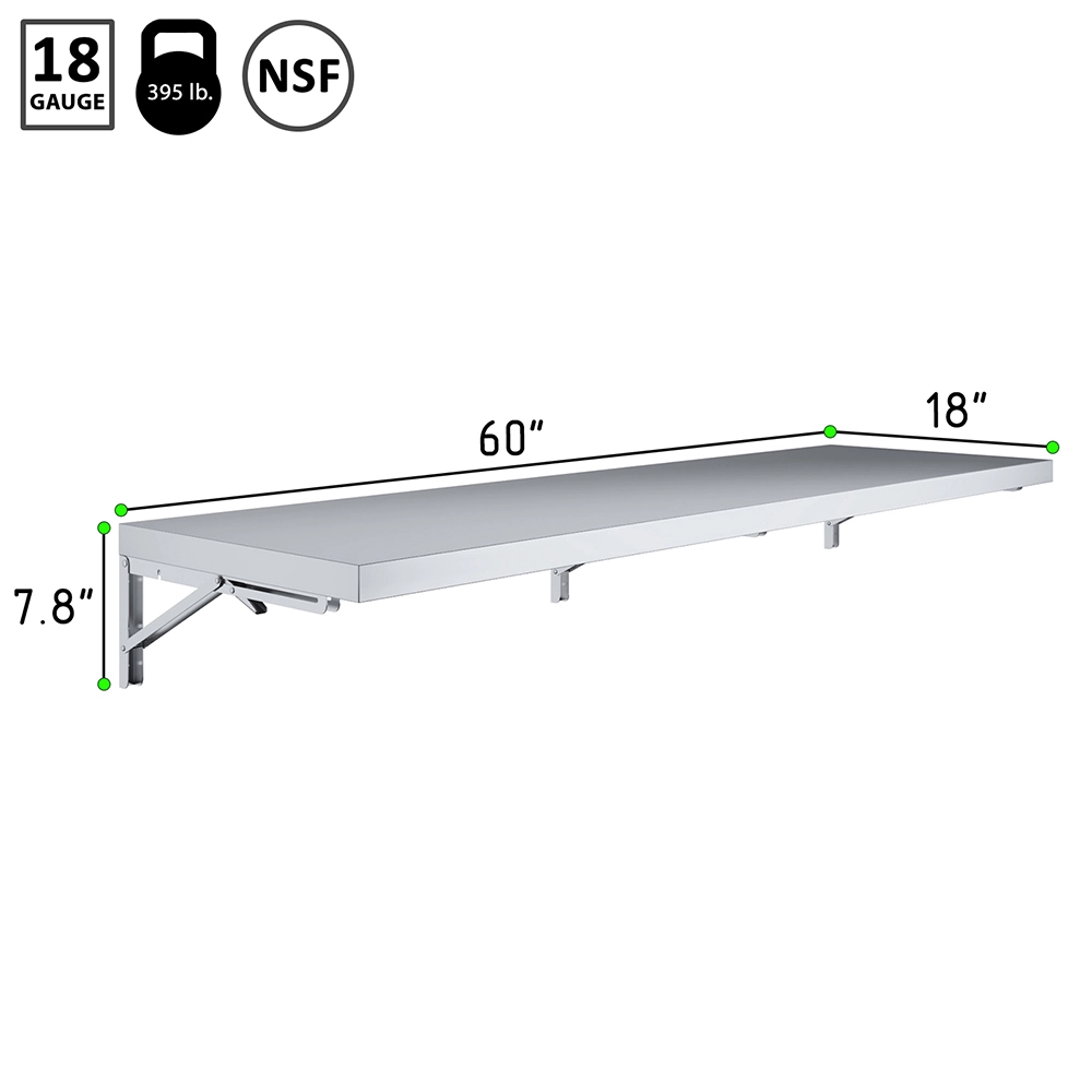 Introducing our 18″ x 60″ Stainless Steel Folding Wall Shelf, an innovative solution for maximizing space and organization in your kitchen, garage, or workspace. This quality shelf is meticulously crafted from 18GA/430 stainless steel, ensuring exceptional durability and resistance, making it ideal for both indoor and outdoor use. The sleek, modern design seamlessly integrates into any setting, adding both functionality and aesthetic appeal.