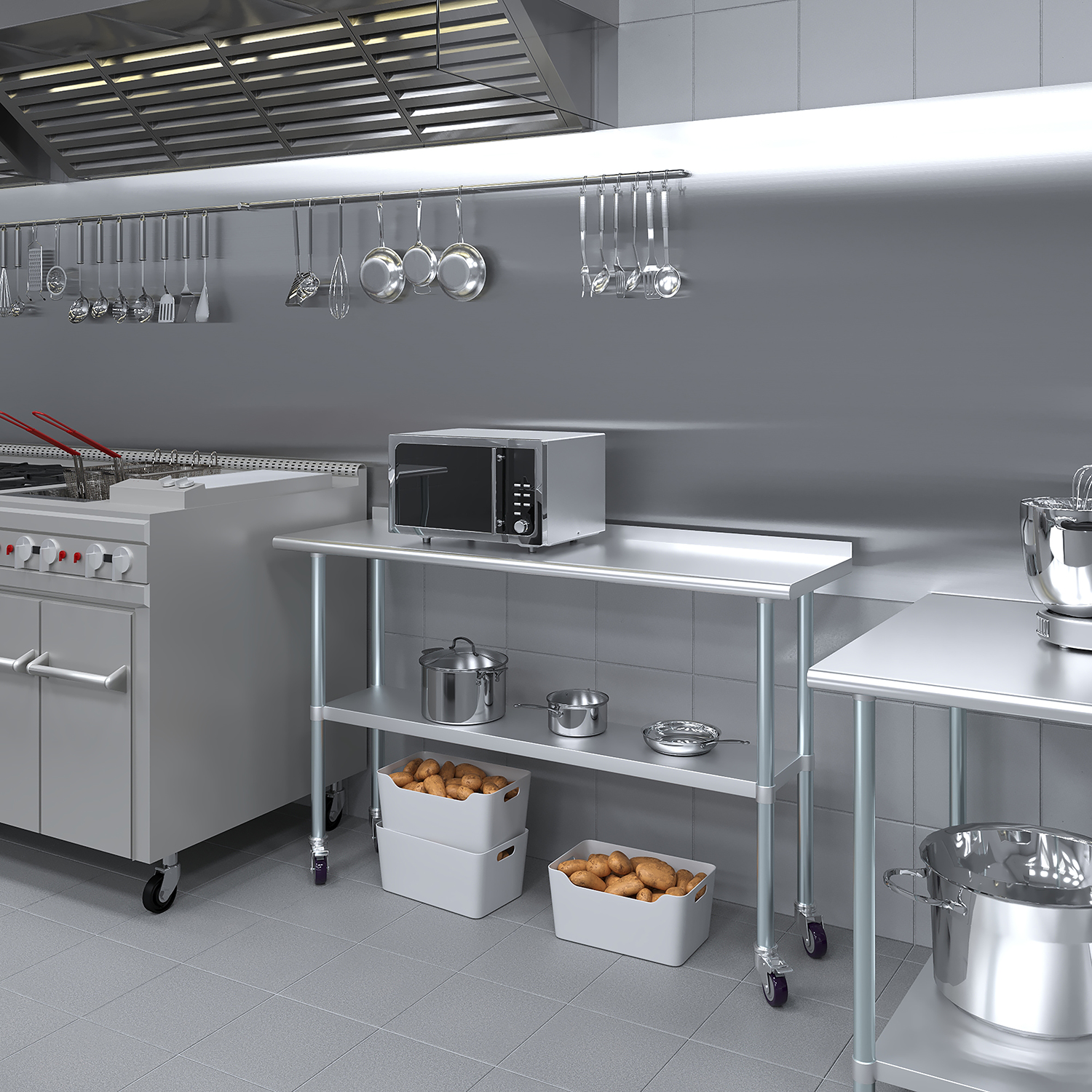 The 1.5″ backsplash is designed to contain spills and splashes, protecting your walls and maintaining a clean, sanitary work area. This feature is especially beneficial in food preparation settings where hygiene is crucial. The sleek, smooth surface of the table allows for effortless cleaning, helping you maintain high standards of cleanliness with minimal effort.