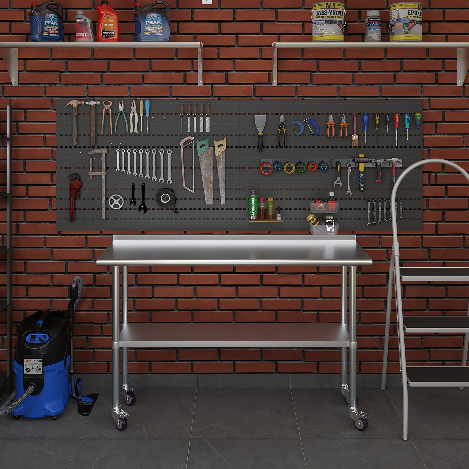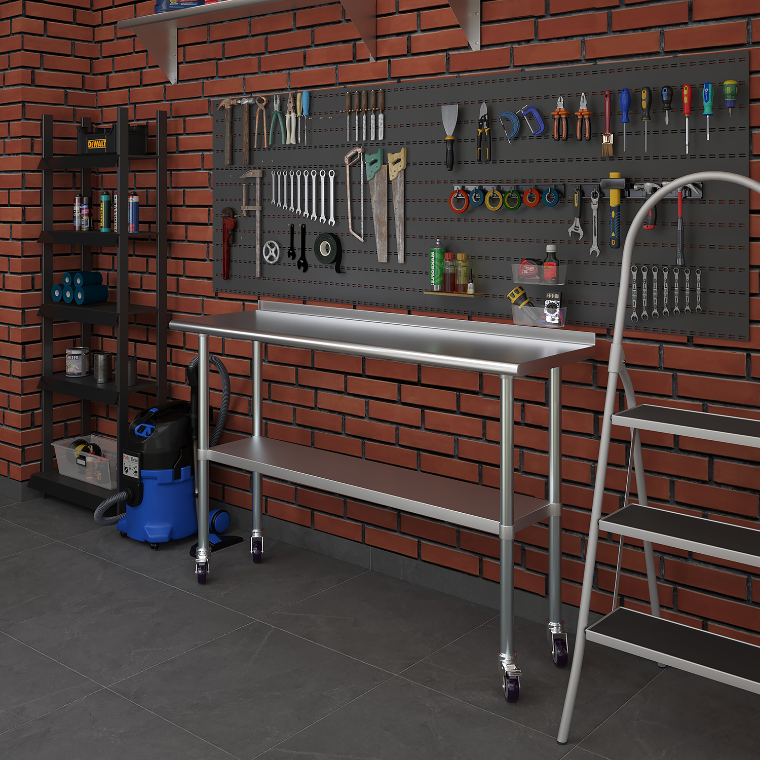 Equipped with a set of four wheels, this work table offers unparalleled mobility. The wheels are designed to glide smoothly across different surfaces, allowing you to reposition the table effortlessly as needed. This mobility is particularly beneficial in dynamic environments where flexibility and adaptability are crucial. Additionally, the wheels are equipped with locking mechanisms to ensure stability and prevent unwanted movement during use.