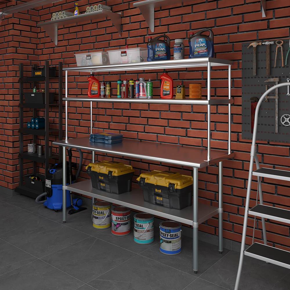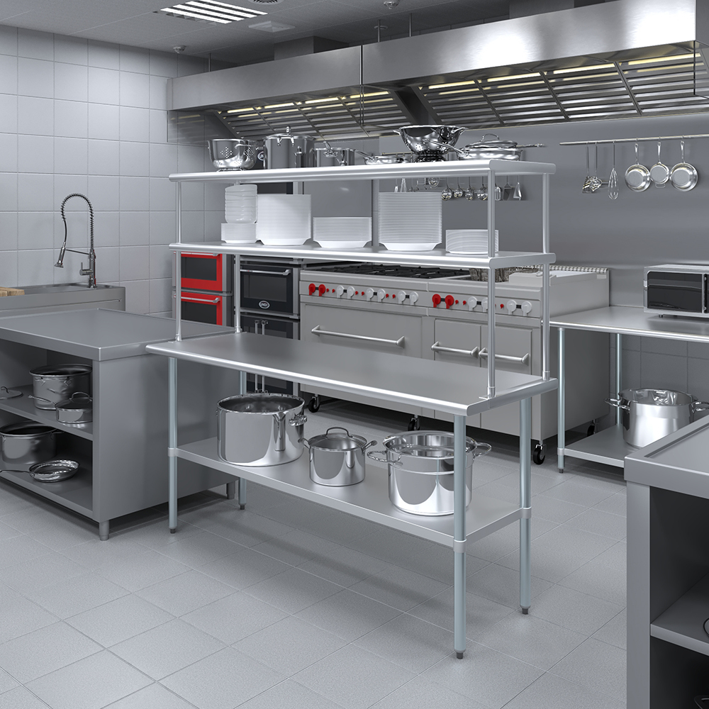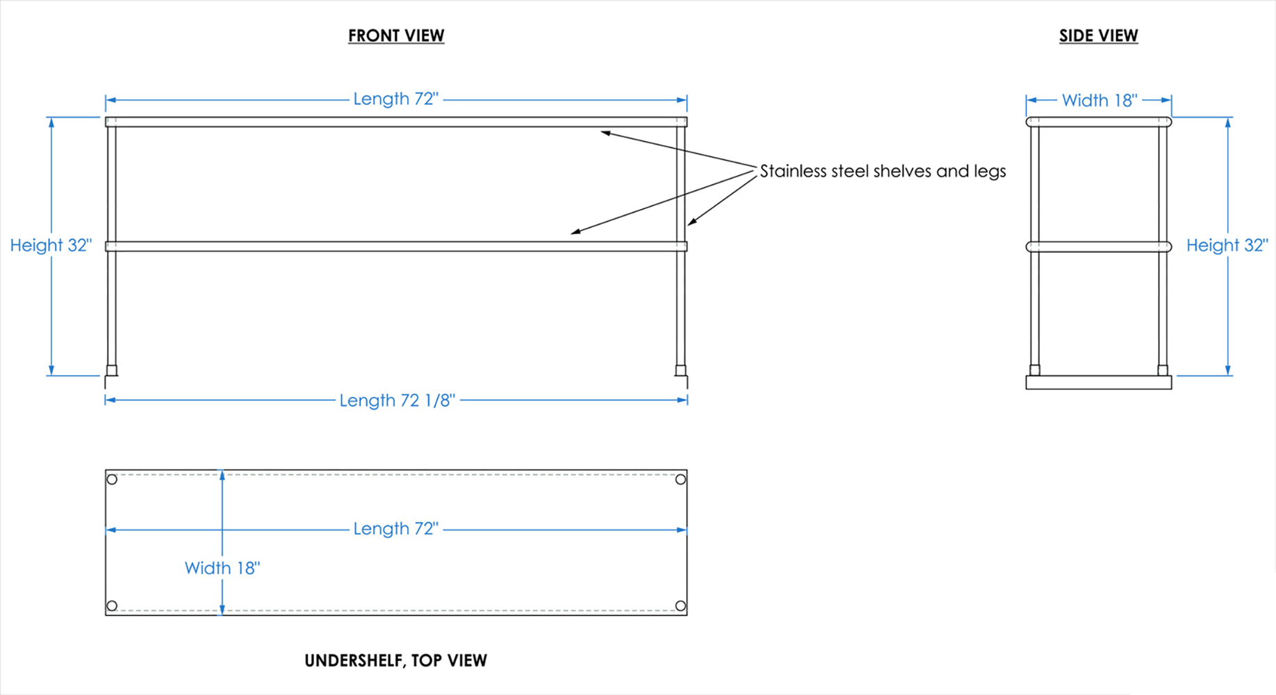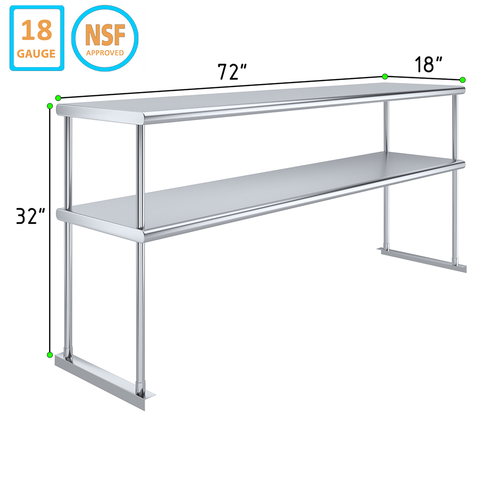 Measuring 18 inches in width and 72 inches in length, this compact yet spacious shelf offers ample storage space across two tiers. The double-tier design maximizes vertical storage capacity, making it ideal for organizing a variety of kitchen essentials, including utensils, ingredients, cookware, and equipment. The open-shelf design allows for easy access and quick retrieval of items, streamlining your workflow and improving productivity.