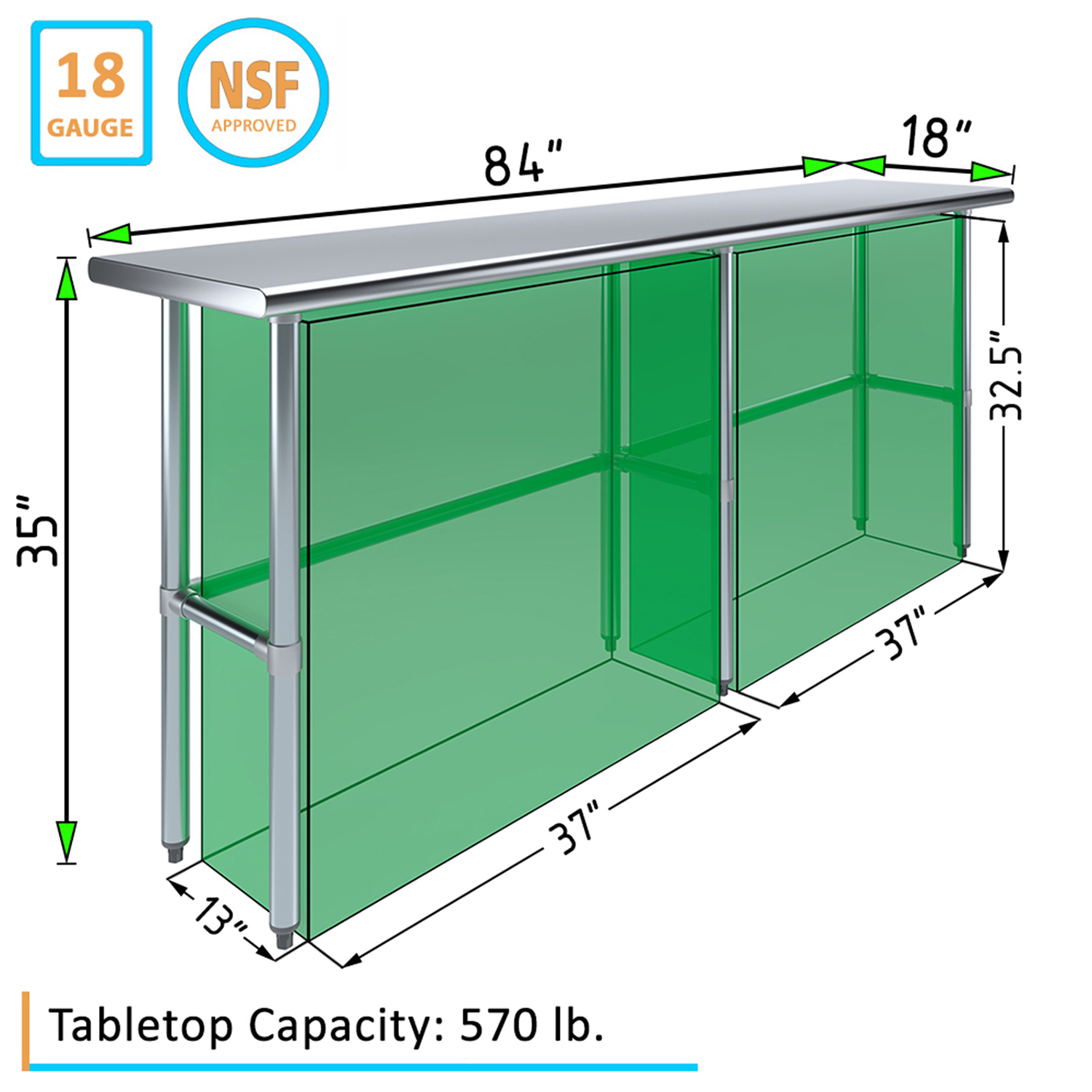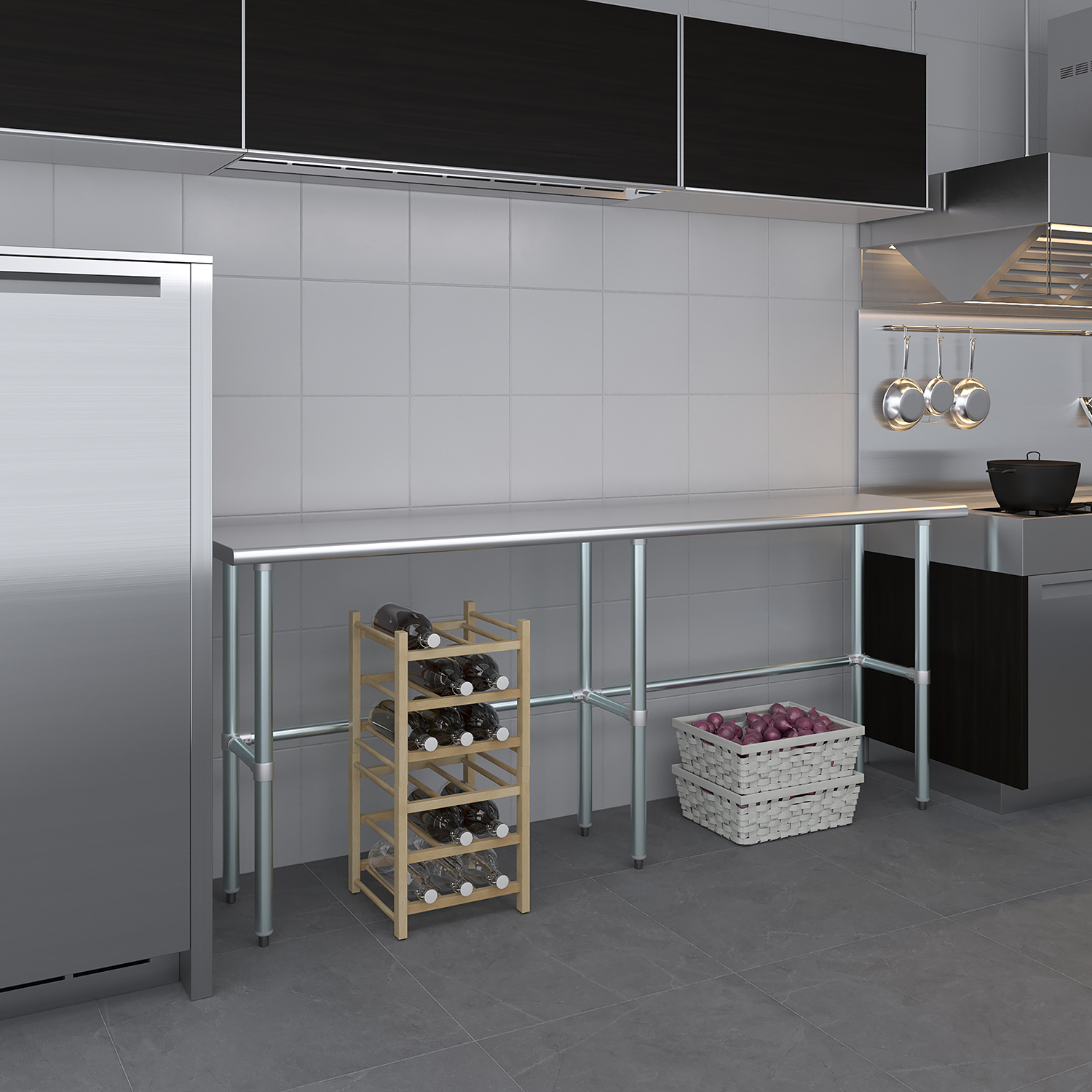 Enhance your workspace with the versatile and durable 18″ x 84″ Stainless Steel Work Table with Open Base. Crafted from 18GA/430 stainless steel, this work table is designed to withstand the rigors of daily use in commercial kitchens, workshops, laboratories, and other demanding environments. Its sleek, smooth surface is not only easy to clean but also resistant, ensuring long-lasting performance and hygiene.