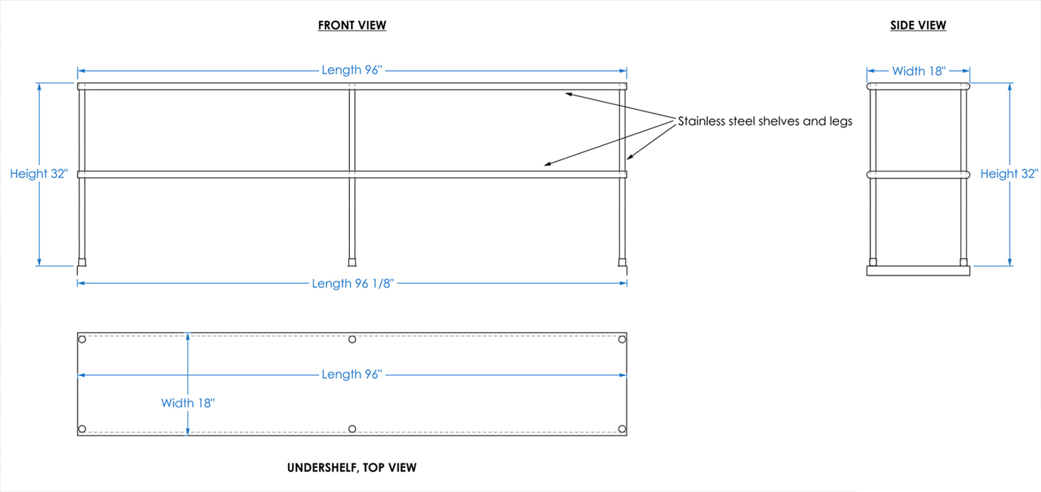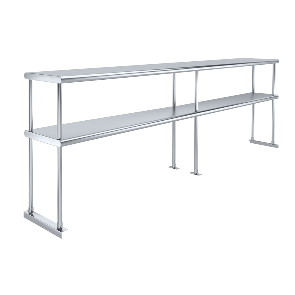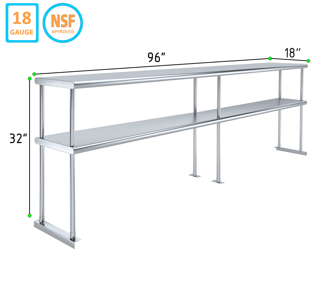 Measuring 18 inches in width and 96 inches in length, this compact yet spacious shelf offers ample storage space across two tiers. The double-tier design maximizes vertical storage capacity, making it ideal for organizing a variety of kitchen essentials, including utensils, ingredients, cookware, and equipment. The open-shelf design allows for easy access and quick retrieval of items, streamlining your workflow and improving productivity.