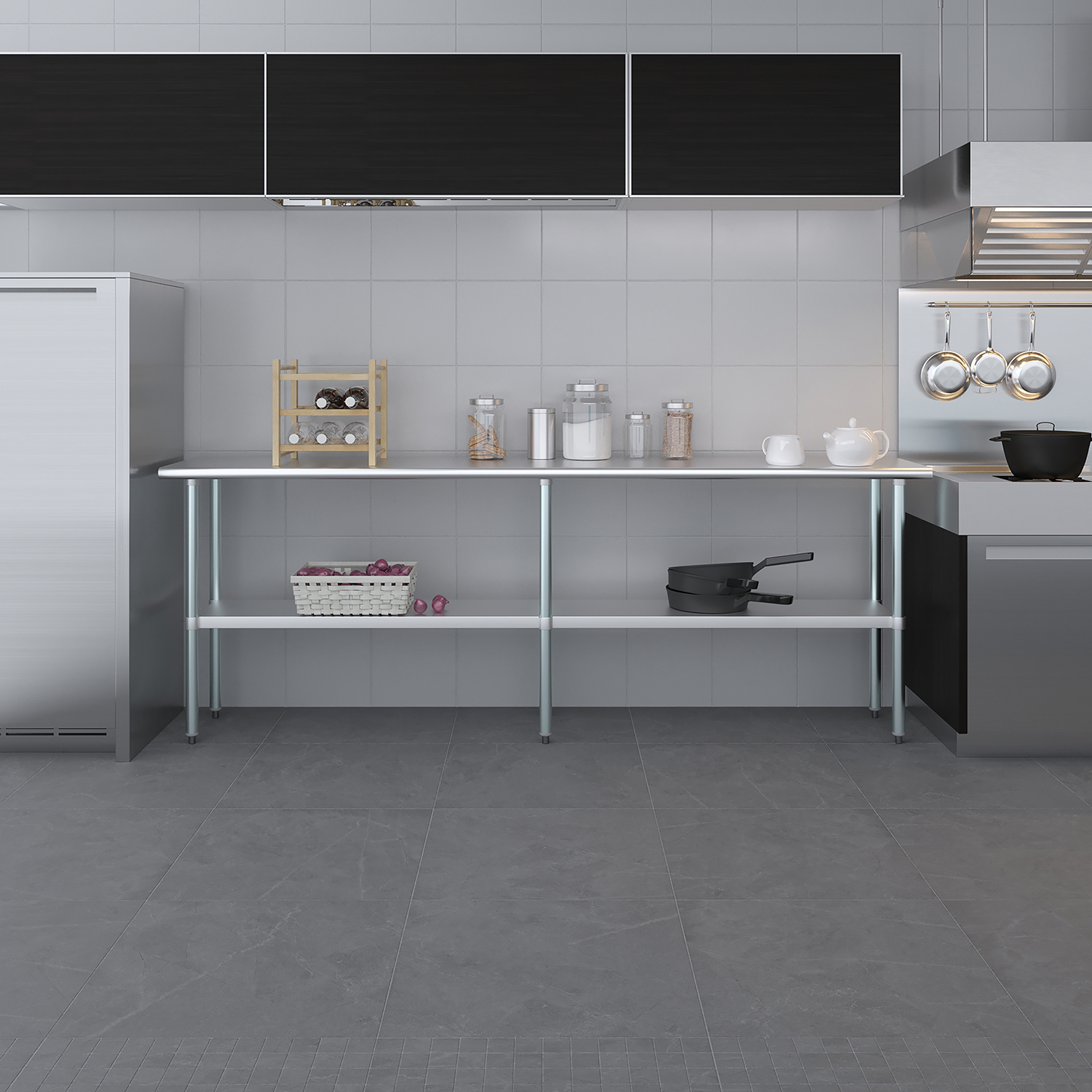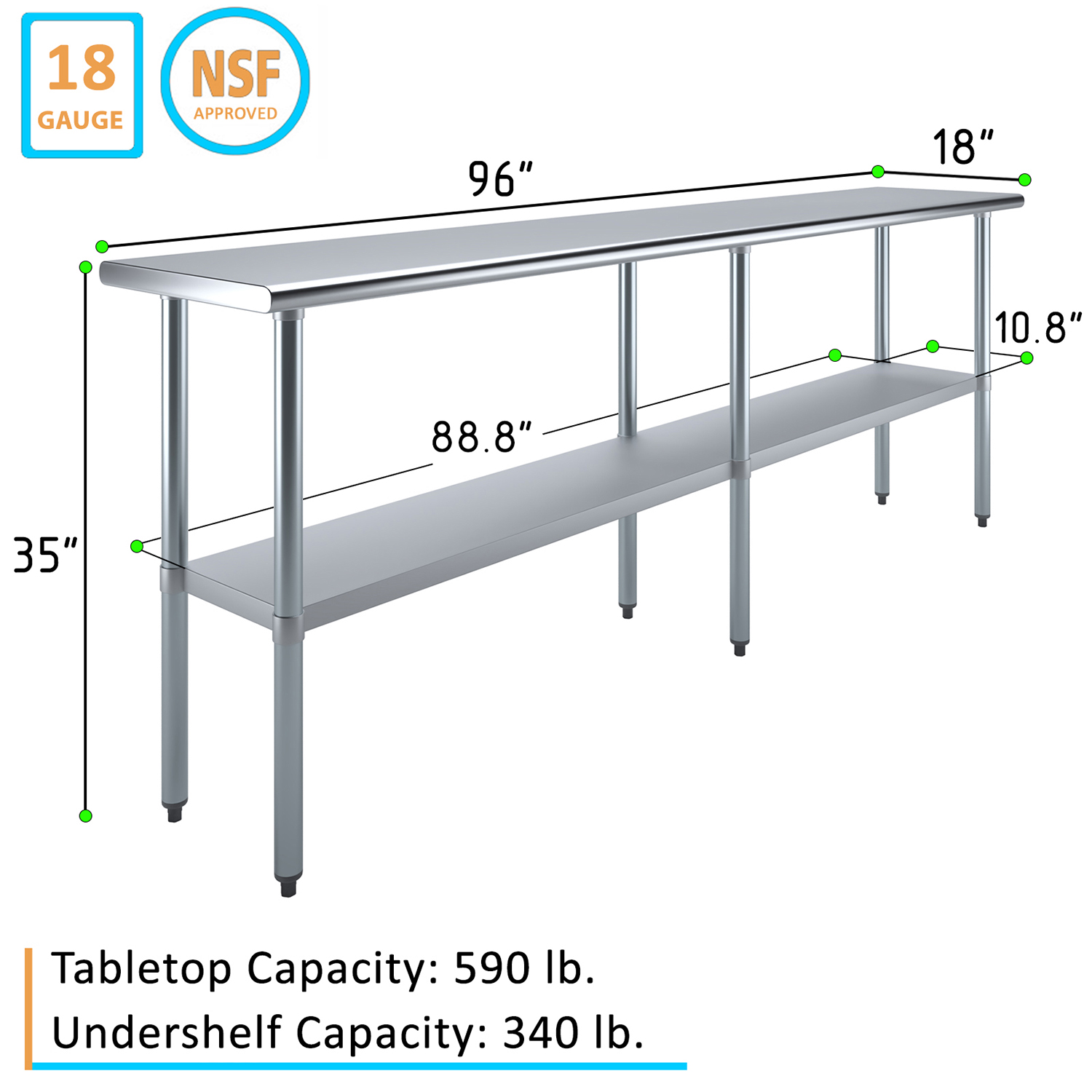 The spacious 18″ x 96″ tabletop provides ample workspace for a variety of tasks, including food preparation, equipment handling, and general workspace organization. Its smooth, polished surface is easy to clean and maintain, ensuring a hygienic environment that meets the high standards of any commercial setting.