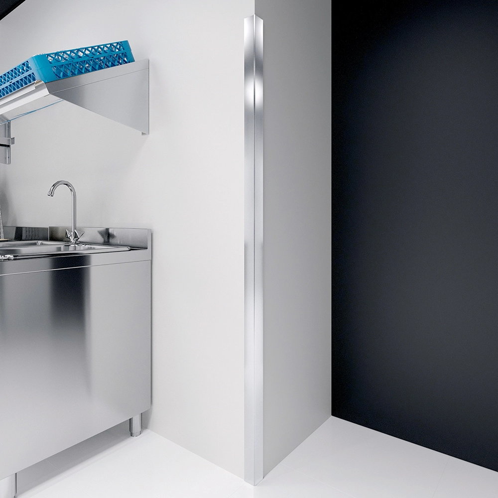The 2 in. x 2 in. x 72 in. Stainless Steel Outside Corner Guard is a reliable and professional solution designed to protect exposed wall corners in high-traffic commercial and industrial environments. Constructed from 18GA/430 stainless steel, this corner guard is built to withstand daily wear and impact from carts, equipment, and foot traffic, making it ideal for commercial kitchens, hospitals, laboratories, warehouses, and other demanding spaces.