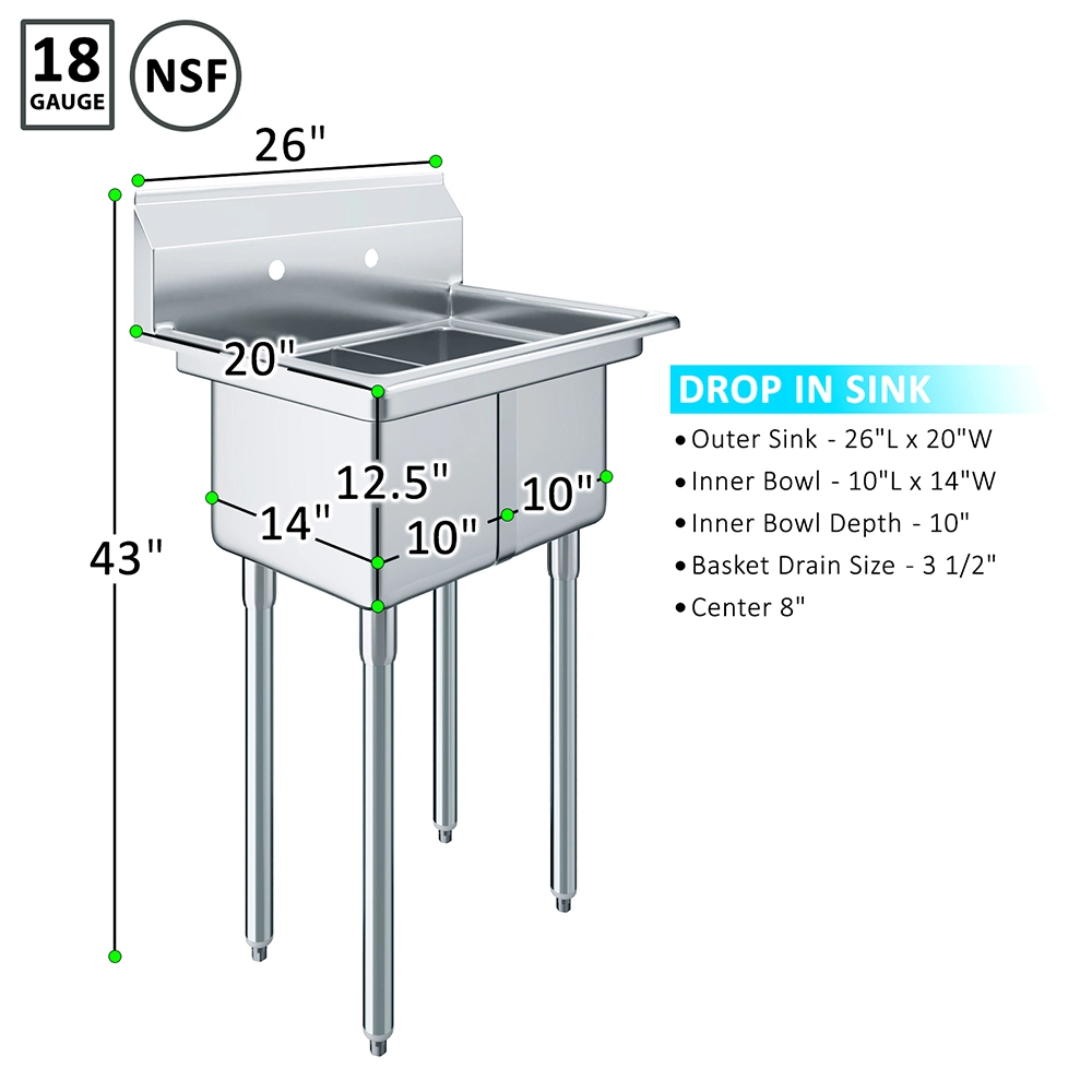 Measuring 20 inches by 26 inches, this sink is compact enough to fit into smaller spaces while maintaining the functionality needed for everyday tasks. Its sturdy construction ensures stability and reliable performance, even under heavy use. The smooth stainless steel surface is easy to clean, promoting hygiene and making it suitable for food preparation and general cleaning.