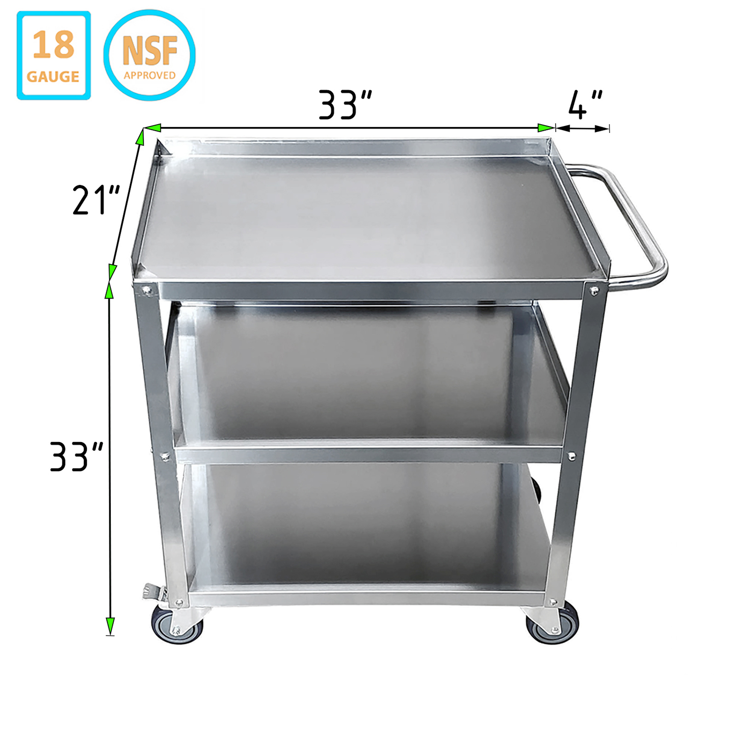 Introducing the 21″ Wide X 33″ Long X 33″ Height Stainless Steel 3 Shelf Utility Cart with Wheels, designed to bring unparalleled convenience and efficiency to your commercial kitchen, restaurant, or catering service. This utility cart is meticulously crafted from 18GA/430 stainless steel, offering superior durability and ensuring long-lasting performance even in the most demanding environments.