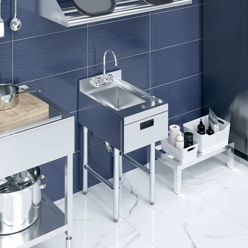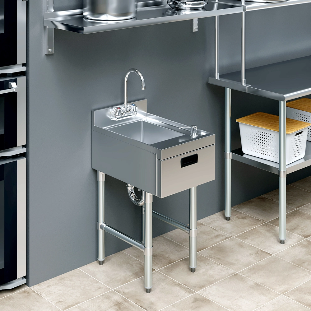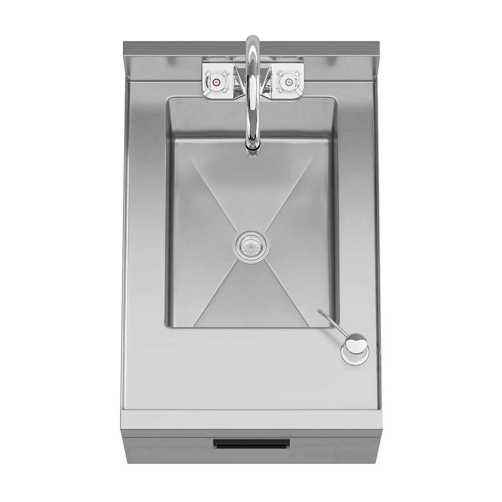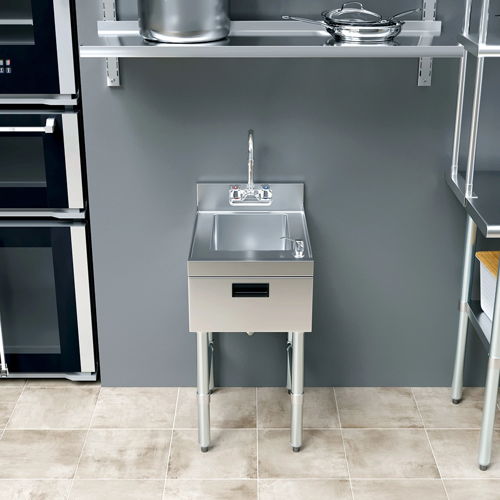This space-saving sink includes integrated soap and towel dispensers, promoting proper handwashing practices and helping maintain compliance with health and safety regulations. The deep sink bowl allows for thorough handwashing, while the included dispensers provide added convenience for staff working in fast-paced settings.
