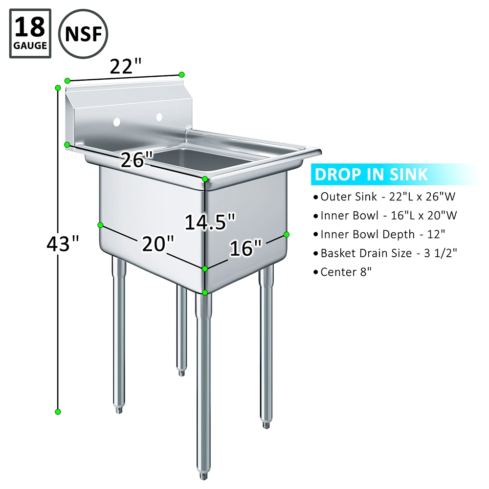 Upgrade your workspace with the 22 in. x 26 in. Stainless Steel One-Compartment Sink, a durable and versatile solution for a wide range of cleaning and prep tasks. Constructed from 18GA/304 stainless steel, this sink is designed to resist corrosion and stains, ensuring long-lasting performance in demanding environments such as commercial kitchens, utility rooms, and workshops.