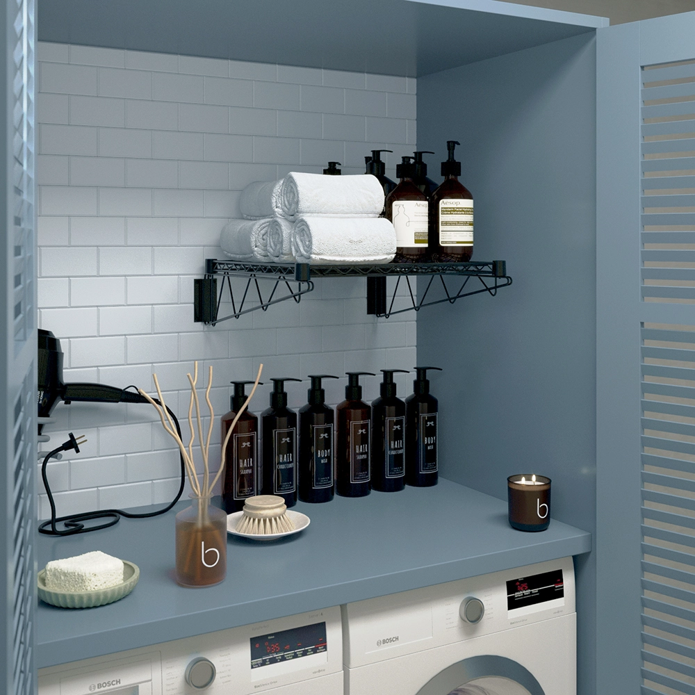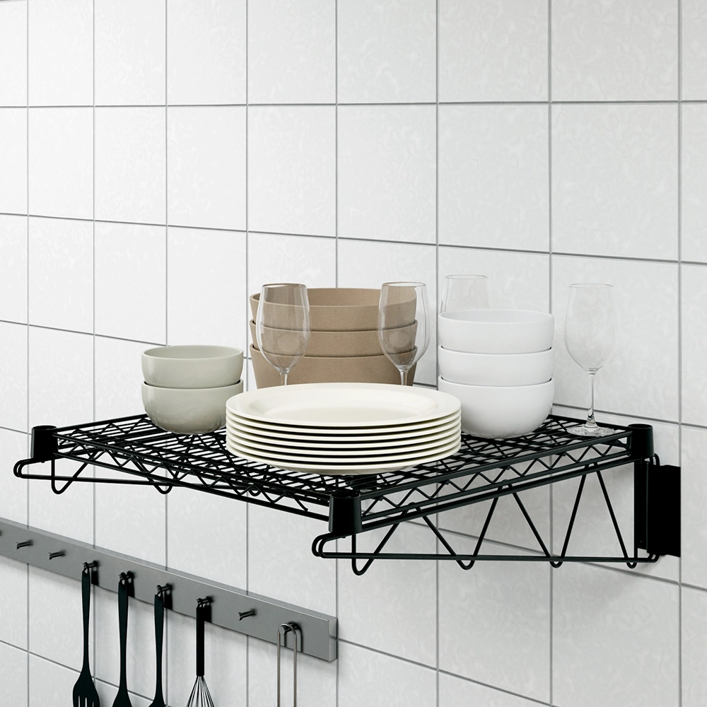 This wall-mounted shelf includes sturdy brackets for secure installation, providing reliable support and stability. It is perfect for storing kitchen essentials, cookware, cleaning supplies, tools, or decorative items. Its sleek black finish adds a modern, professional touch to any space.