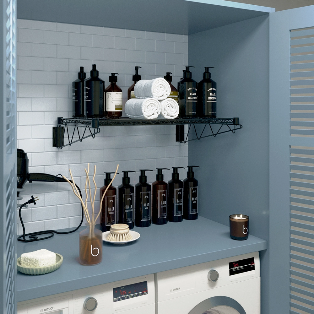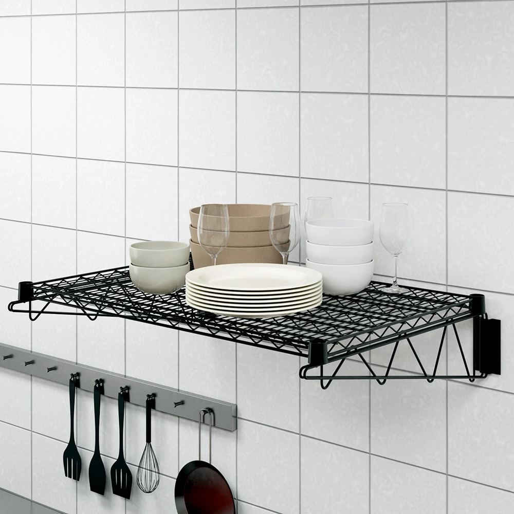 This wall-mounted shelf includes sturdy brackets for secure installation, providing reliable support and stability. It is perfect for storing kitchen essentials, cookware, cleaning supplies, tools, or decorative items. Its sleek black finish adds a modern, professional touch to any space.