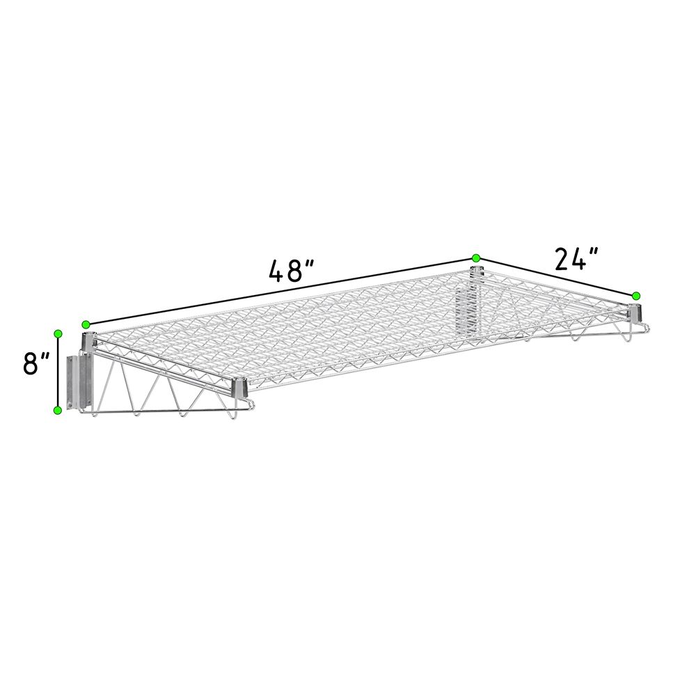 The 24 in. x 48 in. Chrome Wall Mount Wire Shelf With Brackets is a stylish and practical storage solution, ideal for both residential and commercial spaces. Constructed from heavy-duty steel and finished with a high-quality chrome plating, this wire shelf offers superior strength, durability, and resistance to rust and corrosion. Its sleek, reflective surface adds a modern touch to kitchens, pantries, garages, laundry rooms, or retail environments.