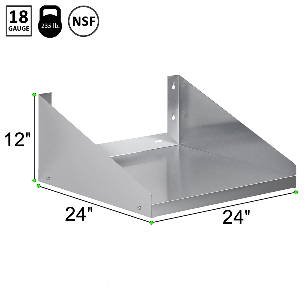 The shelf measures 24 inches in length and 24 inches in depth, providing ample space to store and display a variety of items, from kitchen utensils and appliances to tools and supplies. The addition of side guards is a thoughtful design feature that helps keep your items securely in place, preventing spills and ensuring a neat and orderly storage area. These side guards make the shelf particularly useful in busy kitchens, workshops, and other high-traffic areas where maintaining organization is crucial.