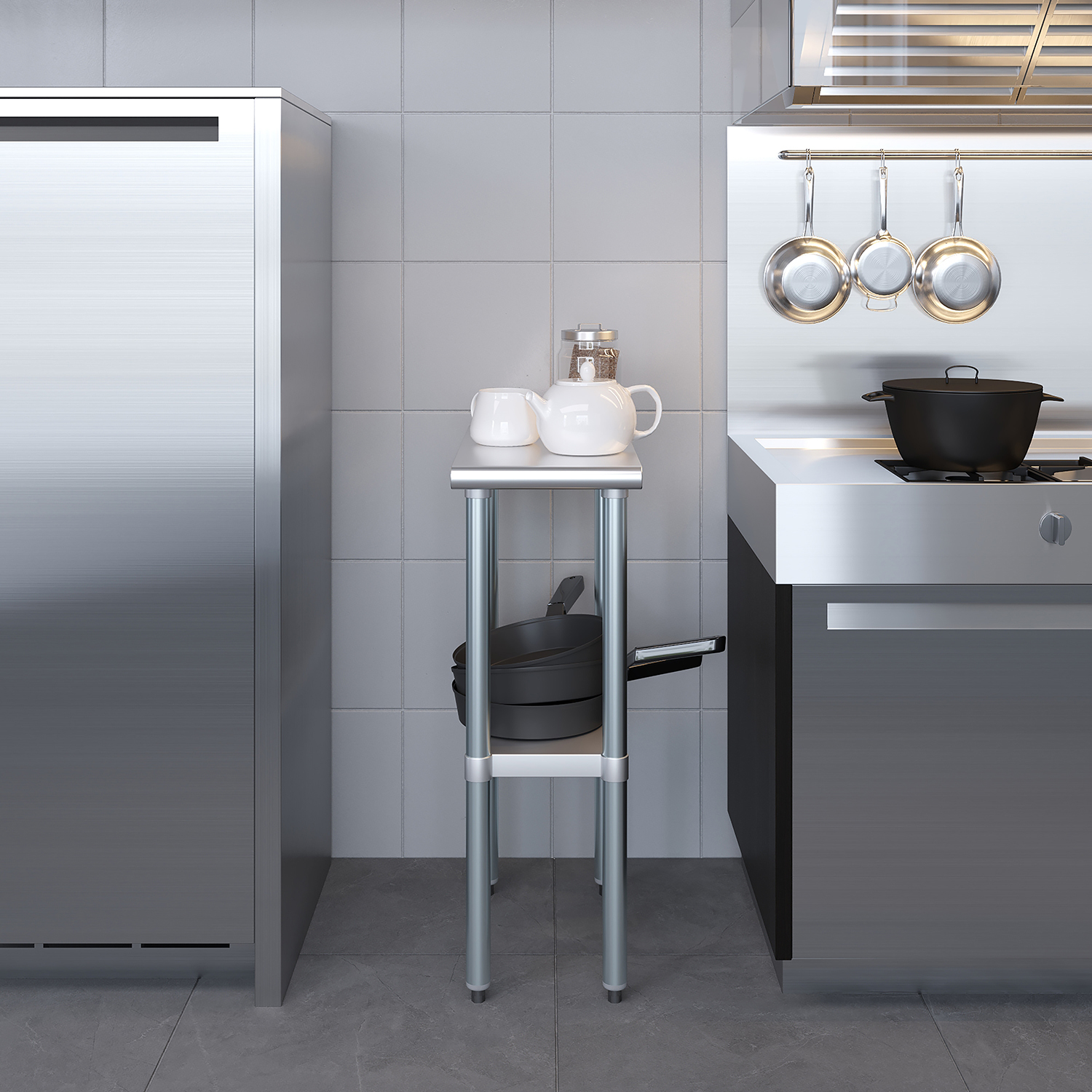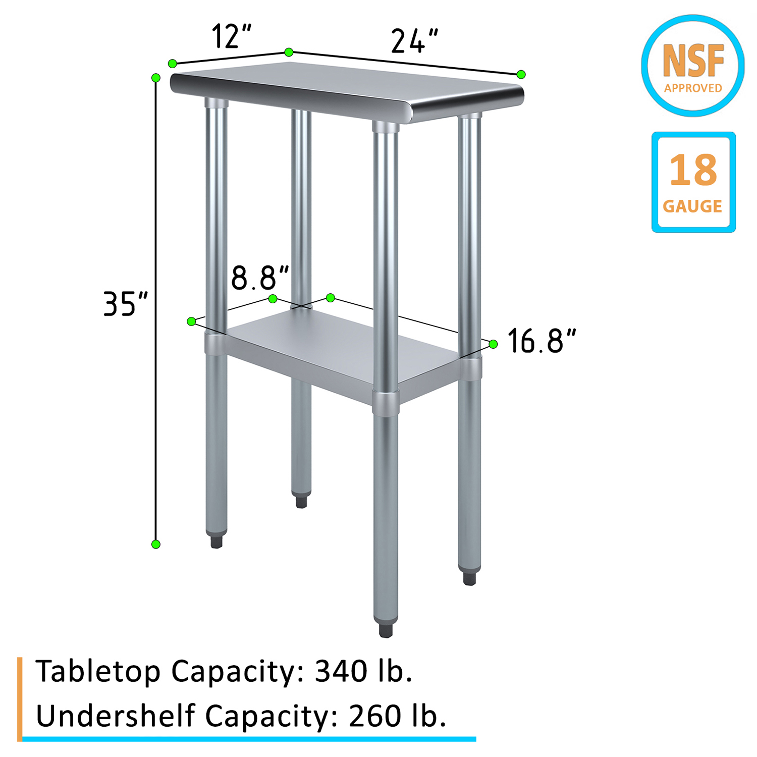The spacious 24″ x 12″ tabletop provides ample workspace for a variety of tasks, including food preparation, equipment handling, and general workspace organization. Its smooth, polished surface is easy to clean and maintain, ensuring a hygienic environment that meets the high standards of any commercial setting.