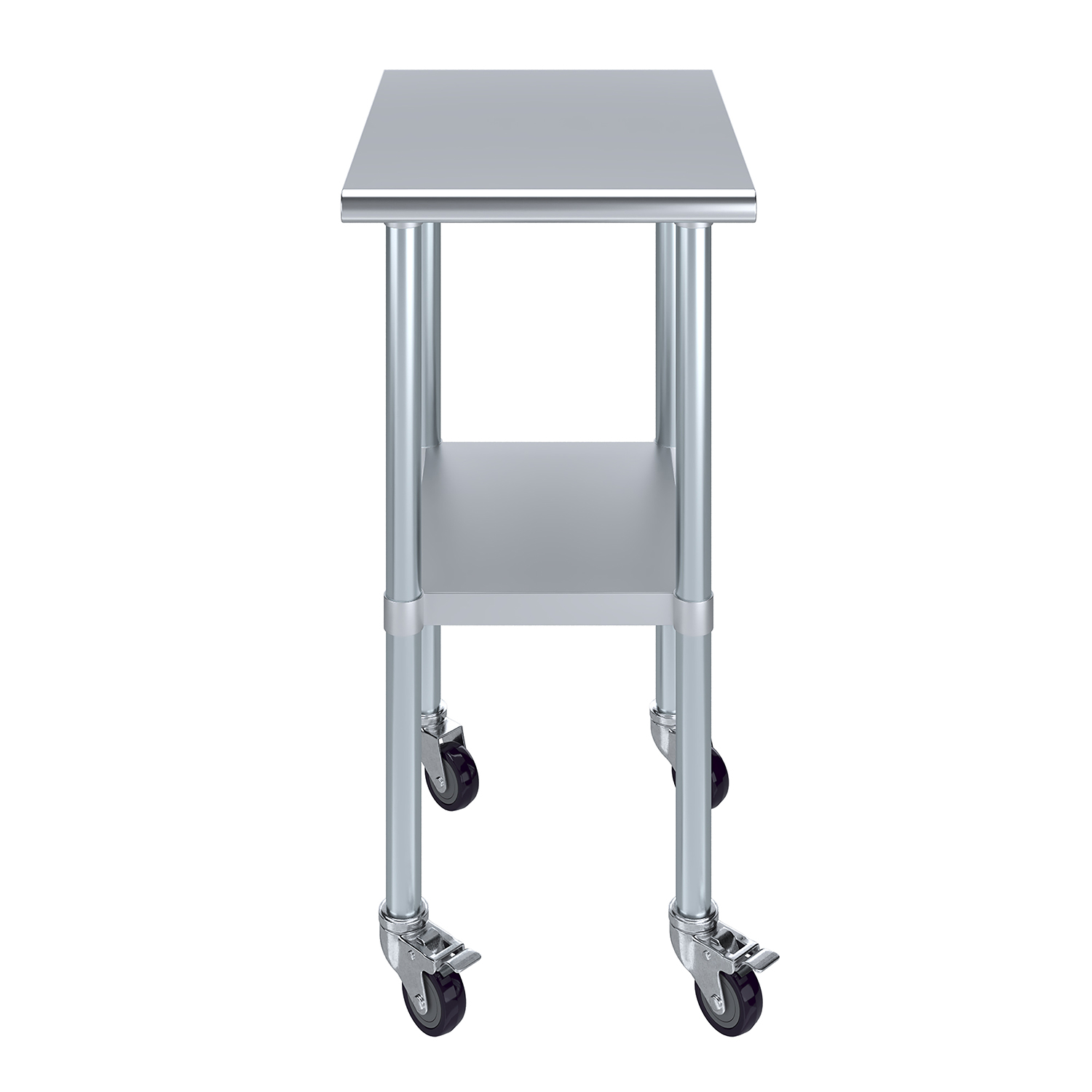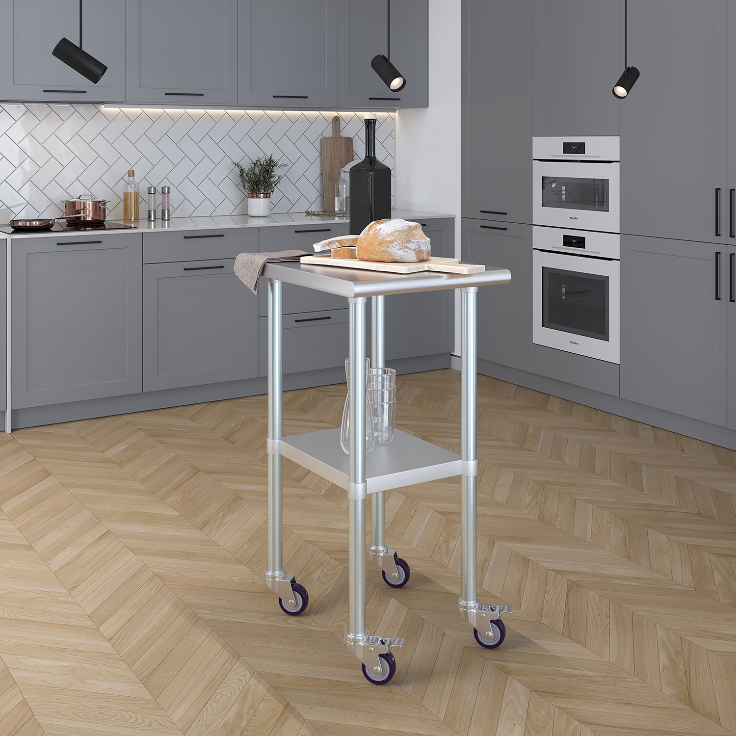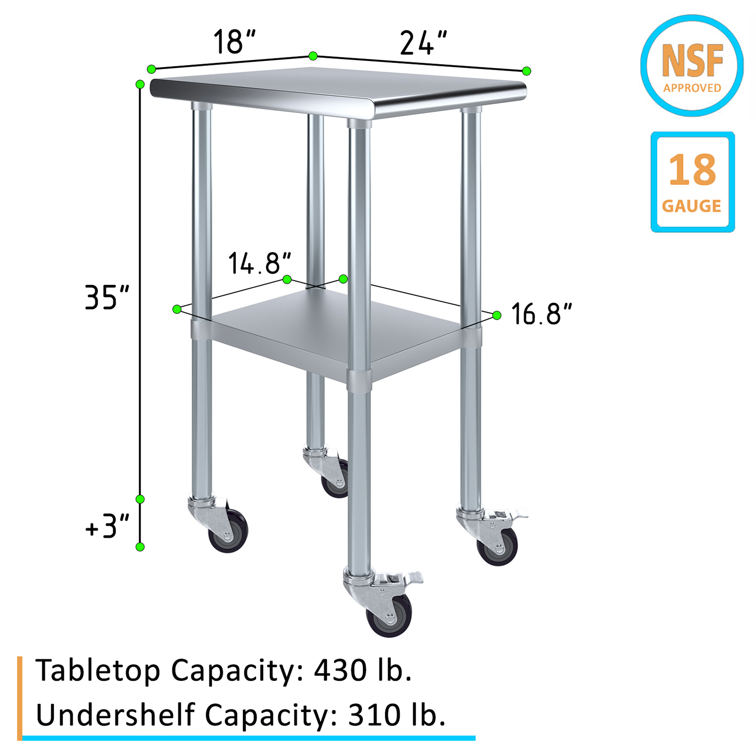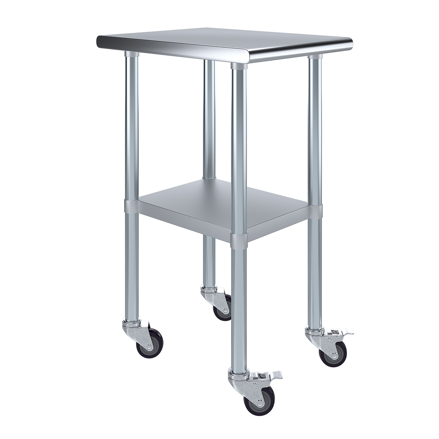 Upgrade your workspace with this versatile and practical work table that combines high functionality with contemporary design. Perfect for enhancing productivity and organization, the 24″ x 18″ Stainless Steel Work Table with Undershelf and Wheels is an indispensable asset for any professional setting, providing durability, convenience, and efficiency in a compact, mobile unit.