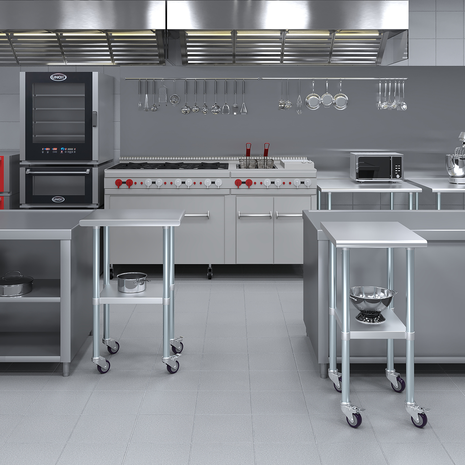 Optimize your workspace with the 24″ x 18″ Stainless Steel Work Table featuring an undershelf and a set of four wheels for enhanced mobility and storage. This work table is constructed from 18GA/430 stainless steel, ensuring a durable, easy-to-clean surface. Designed for demanding environments such as commercial kitchens, laboratories, and workshops, this table guarantees long-lasting performance and reliability.