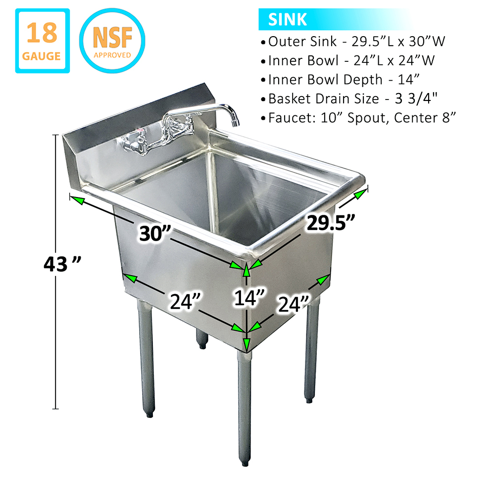 Whether you are upgrading your current setup or outfitting a new space, the 24″ X 24″ One Compartment Stainless Steel Prep & Utility Sink with Faucet is an excellent choice that combines practicality, durability, and style. Elevate your workspace with this qualty sink, designed to meet the demands of any busy commercial environment while providing flexibility and efficiency for all your prep and utility needs.
