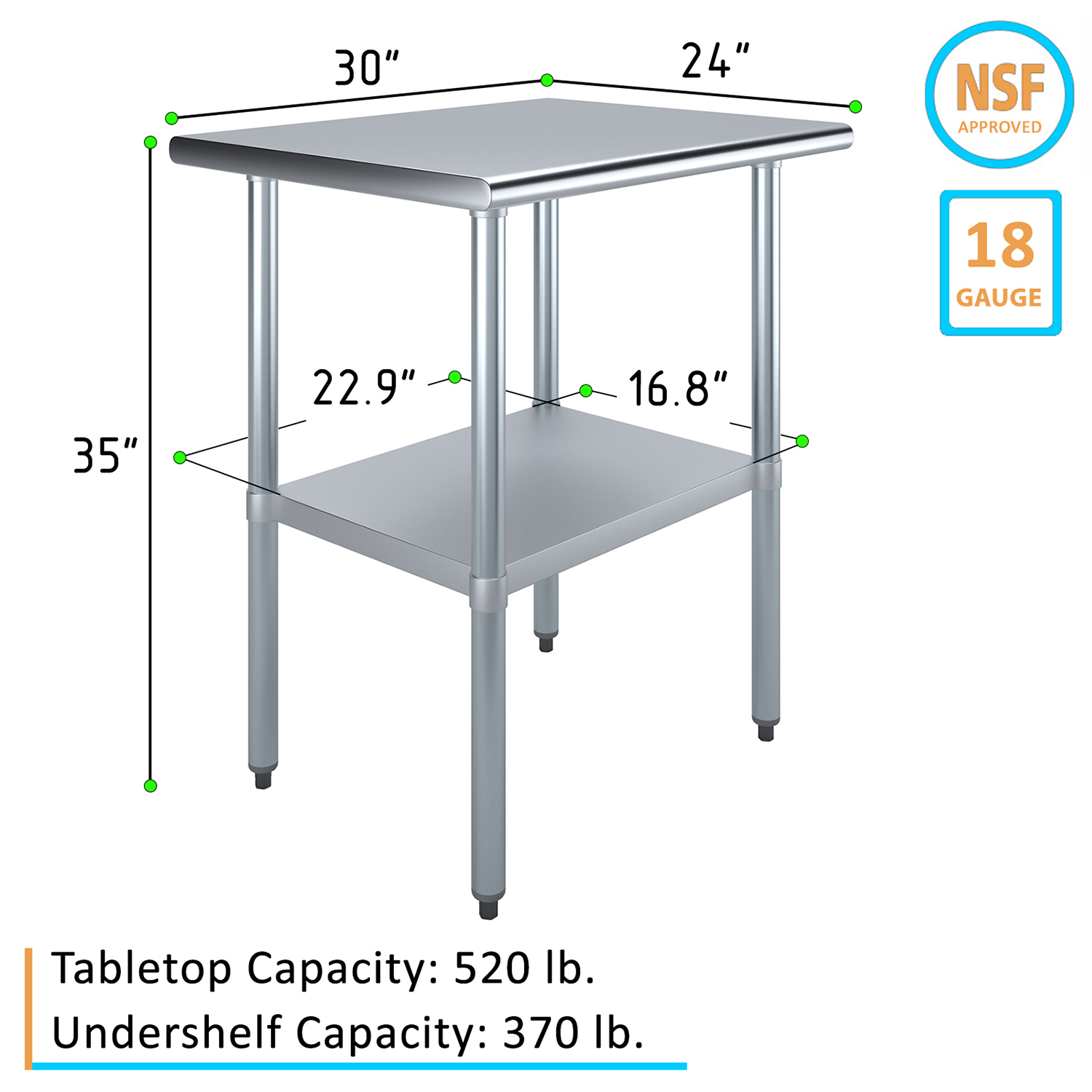The spacious 24″ x 30″ tabletop provides ample workspace for a variety of tasks, including food preparation, equipment handling, and general workspace organization. Its smooth, polished surface is easy to clean and maintain, ensuring a hygienic environment that meets the high standards of any commercial setting.