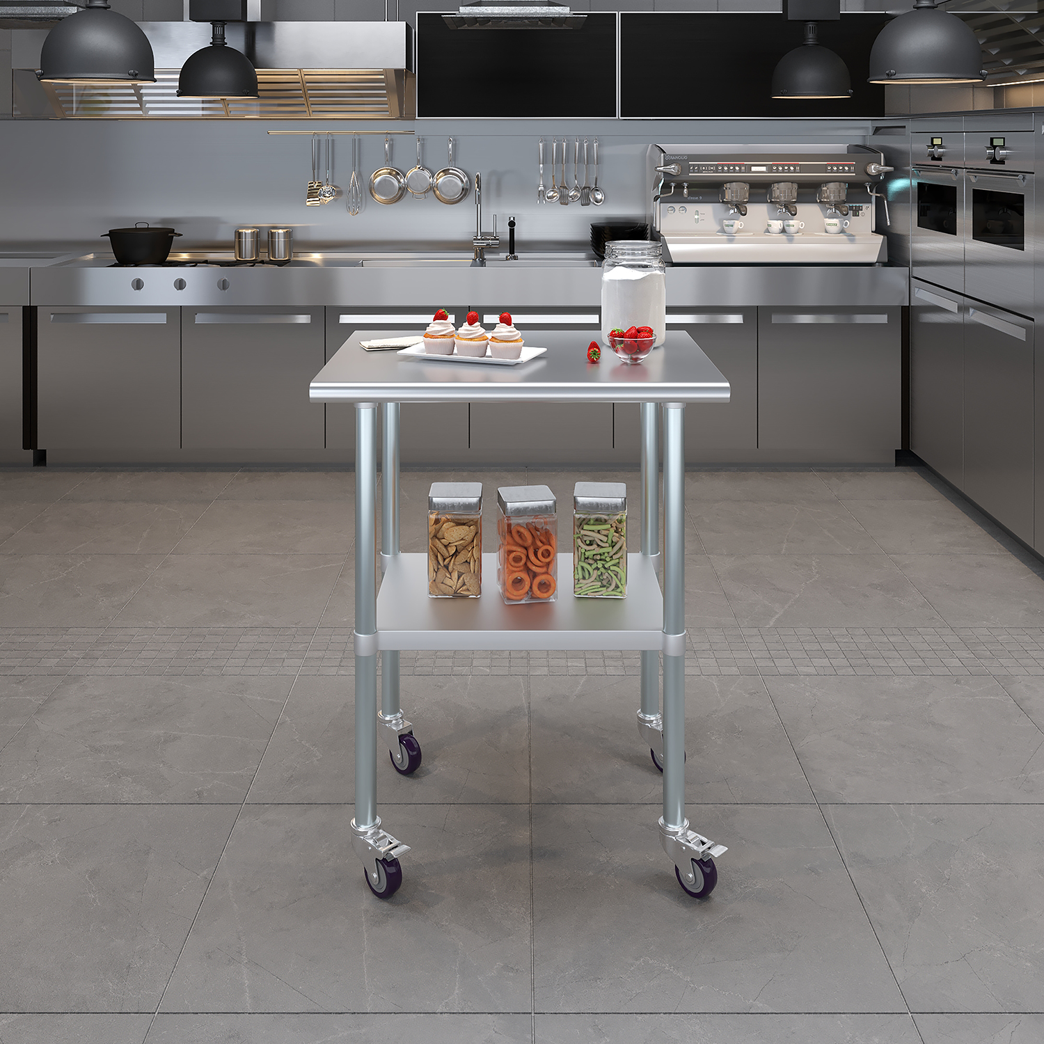 Optimize your workspace with the 24″ x 30″ Stainless Steel Work Table featuring an undershelf and a set of four wheels for enhanced mobility and storage. This work table is constructed from 18GA/430 stainless steel, ensuring a durable, easy-to-clean surface. Designed for demanding environments such as commercial kitchens, laboratories, and workshops, this table guarantees long-lasting performance and reliability.