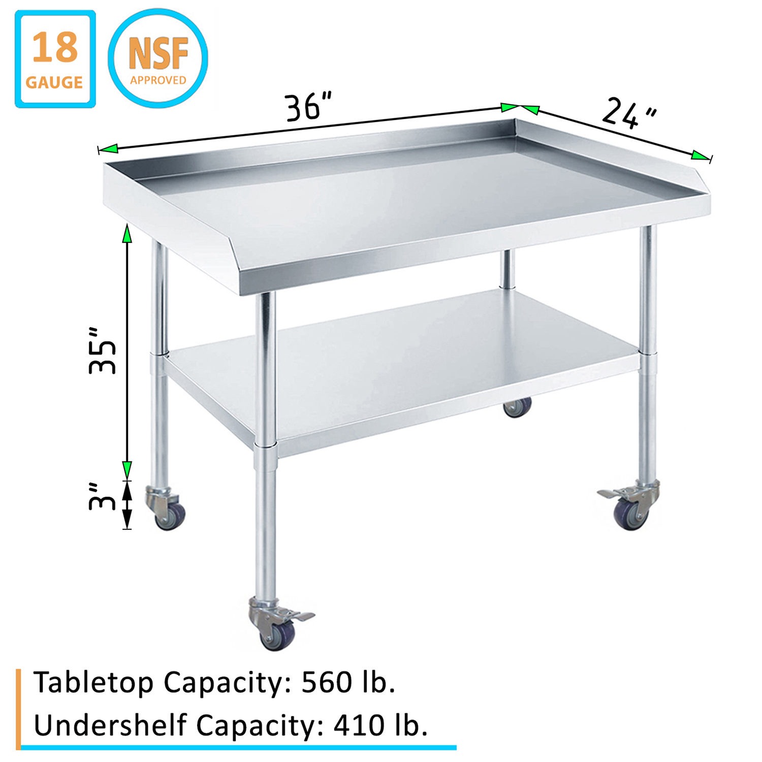 Enhance your kitchen’s efficiency and mobility with our 24″ x 36″ Stainless Steel Equipment Stand, designed with a set of four robust wheels for effortless movement. Constructed from 18GA/430 stainless steel, making it ideal for heavy-duty kitchen equipment such as mixers, slicers, and grinders. The durable construction ensures longevity and stability, while the sleek, polished finish adds a professional touch to any culinary workspace.