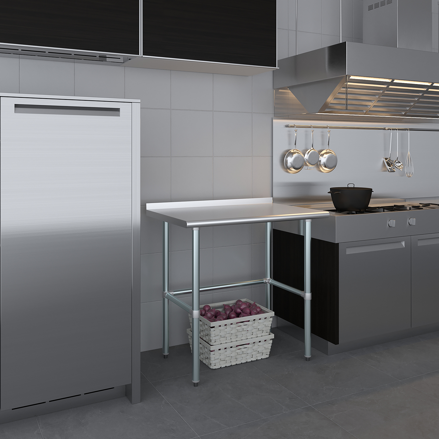 The modern, professional design of the stainless steel work table with open base and backsplash not only enhances functionality but also adds aesthetic value to your workspace. Whether you’re slicing vegetables in a bustling kitchen, conducting research in a lab, or assembling components in a workshop, this work table is a reliable and stylish addition to your environment.