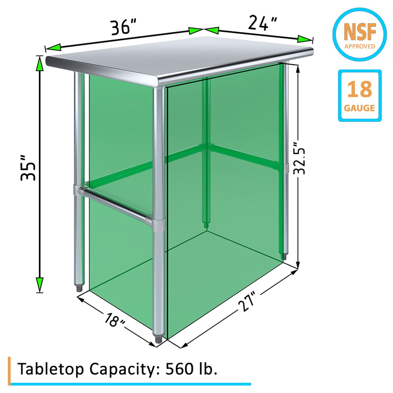 Enhance your workspace with the versatile and durable 24″ x 36″ Stainless Steel Work Table with Open Base. Crafted from 18GA/430 stainless steel, this work table is designed to withstand the rigors of daily use in commercial kitchens, workshops, laboratories, and other demanding environments. Its sleek, smooth surface is not only easy to clean but also resistant, ensuring long-lasting performance and hygiene.