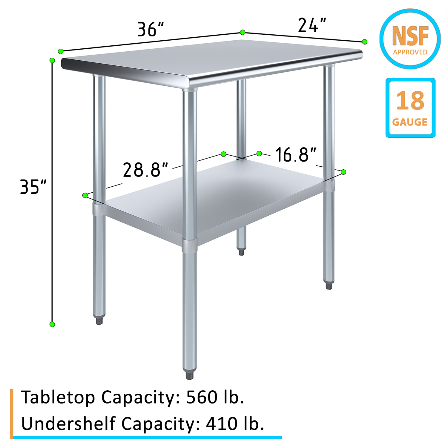 The spacious 24″ x 36″ tabletop provides ample workspace for a variety of tasks, including food preparation, equipment handling, and general workspace organization. Its smooth, polished surface is easy to clean and maintain, ensuring a hygienic environment that meets the high standards of any commercial setting.