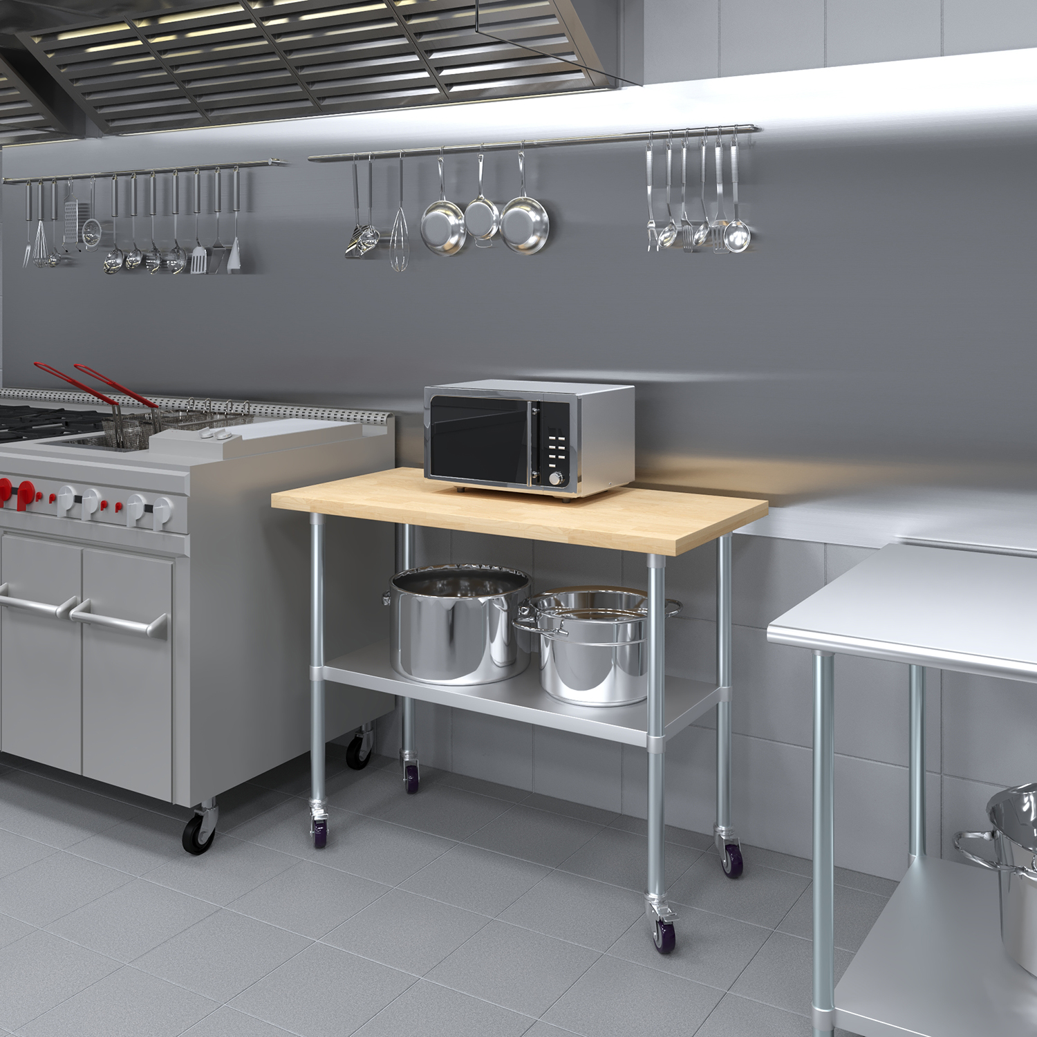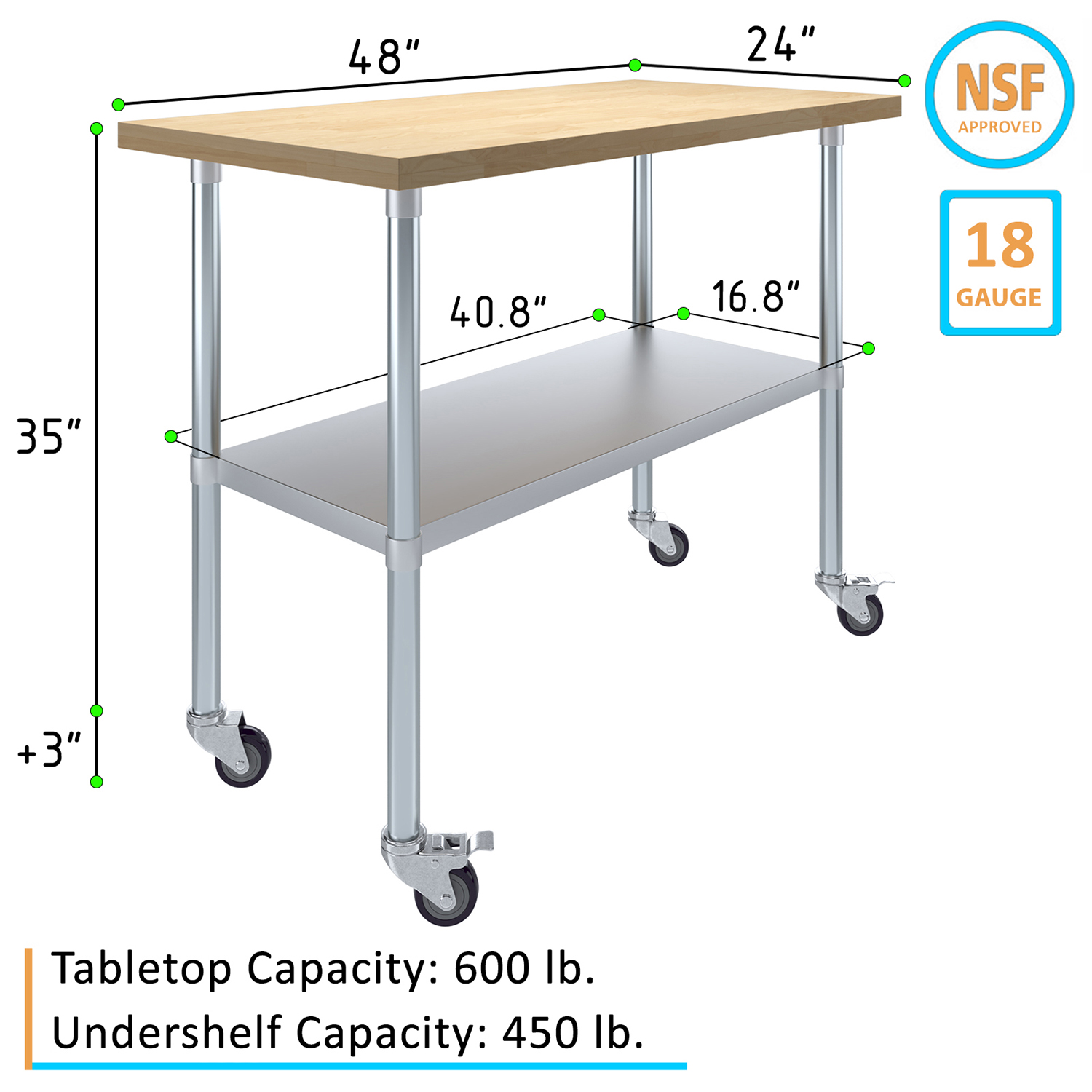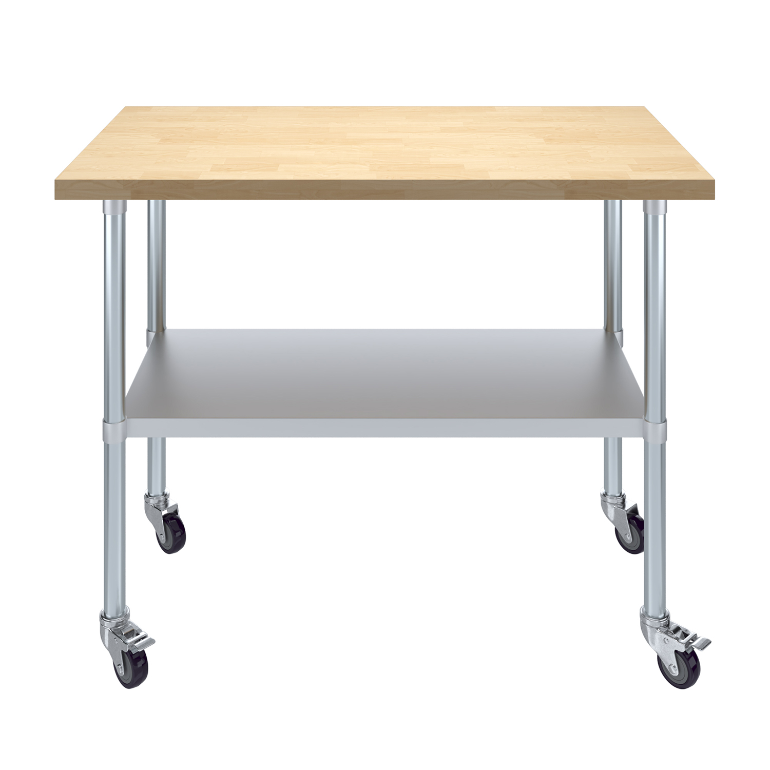 Ideal for both residential and commercial applications, our 24″ x 48″ Maple Wood Top Work Table with Adjustable Undershelf and Wheels is a perfect addition to any workspace. Enhance your kitchen, workshop, or commercial environment with this stylish and practical work table, and experience the benefits of improved organization, efficiency, and mobility. Invest in a quality, versatile work table designed to meet the highest standards of professional use and transform your workspace today.