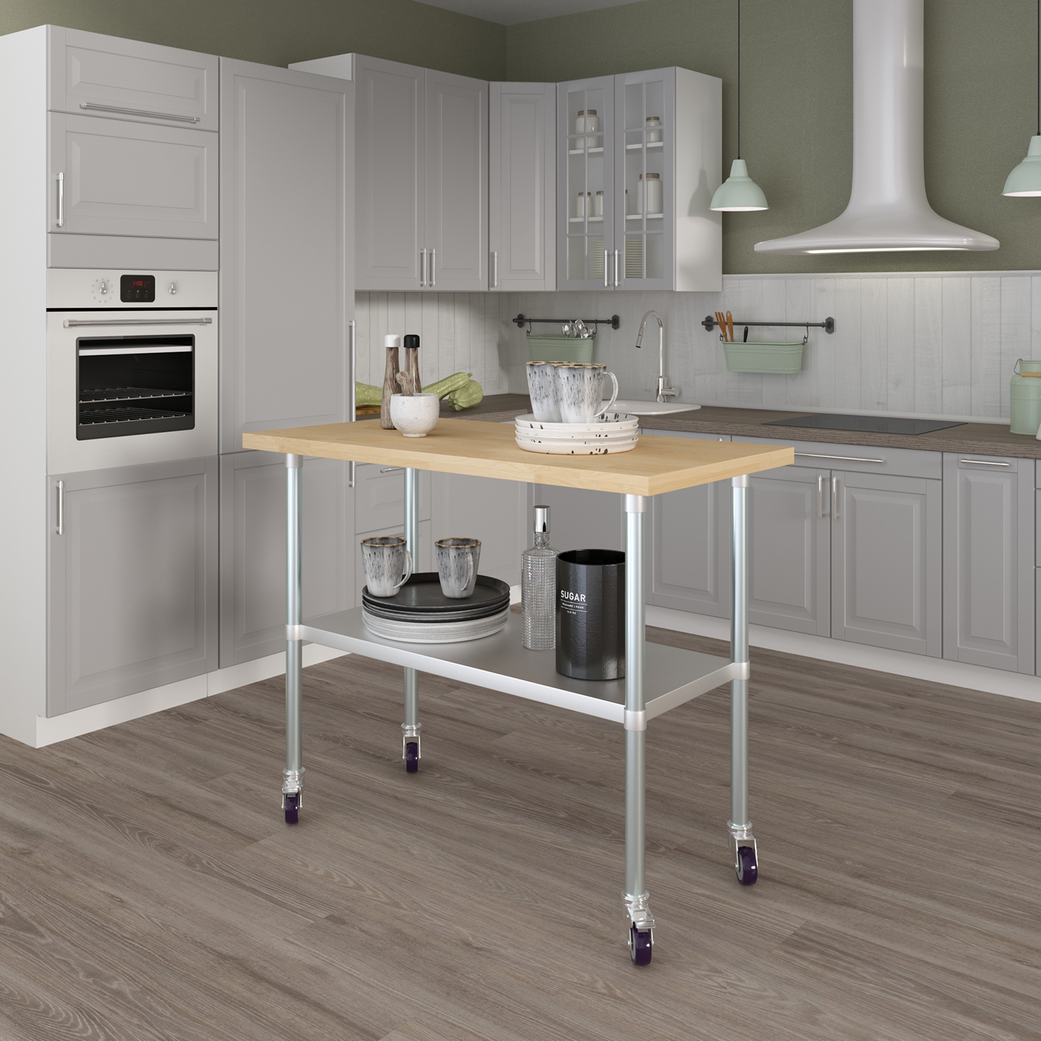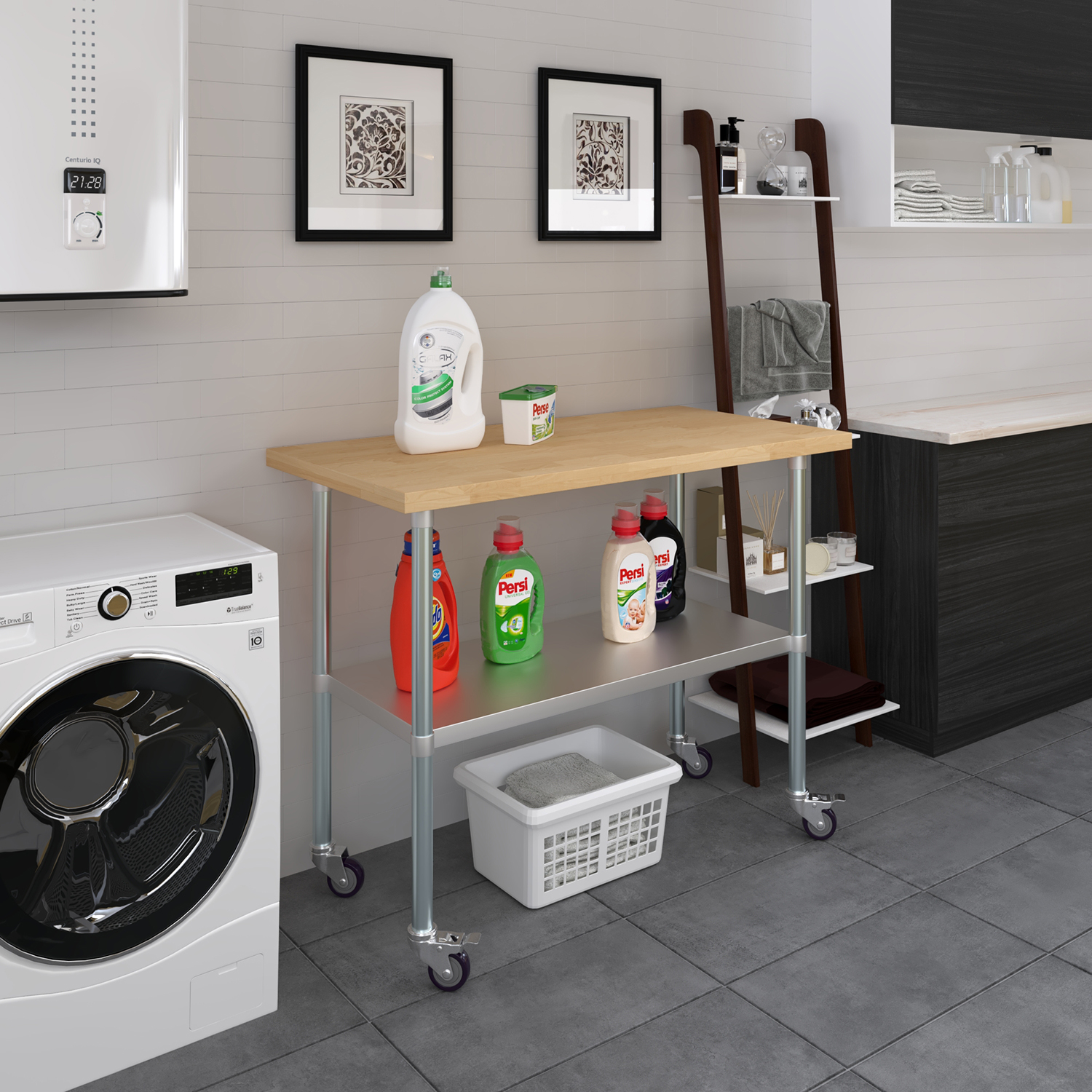 The table is designed for easy assembly, with all necessary hardware and clear instructions included. Its sturdy construction ensures that it can handle heavy loads and rigorous use, providing a reliable and durable workspace that stands up to the demands of any professional setting. The easy-to-clean maple wood top and stainless steel undershelf make maintenance simple, promoting a hygienic environment in areas where cleanliness is paramount.