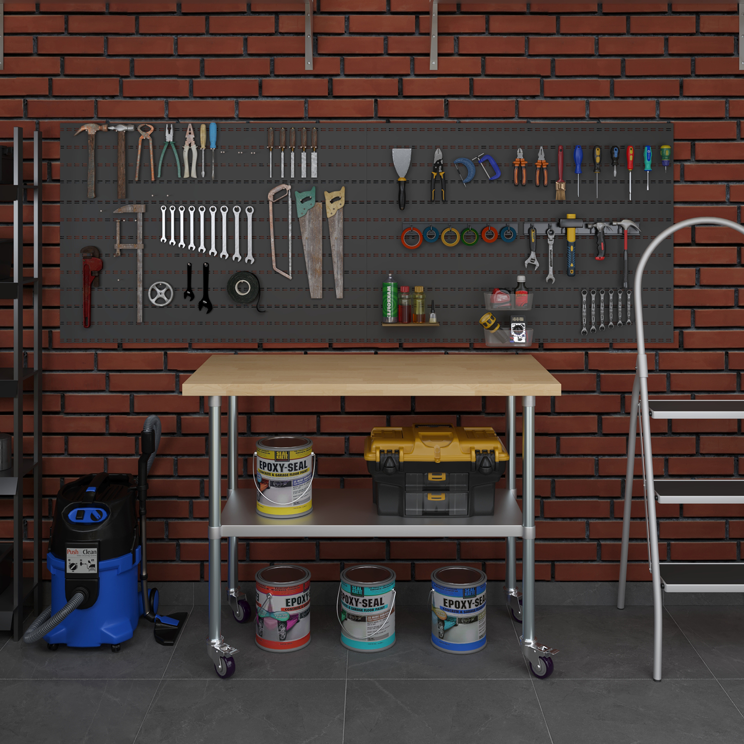 For added convenience, the work table comes with a set of four sturdy wheels, allowing for effortless mobility and repositioning as needed. Whether you need to move the table across the kitchen or reposition it in a workshop, the smooth-rolling wheels make it easy to transport without compromising stability. Two of the wheels are equipped with locking mechanisms, ensuring that the table remains securely in place during use.
