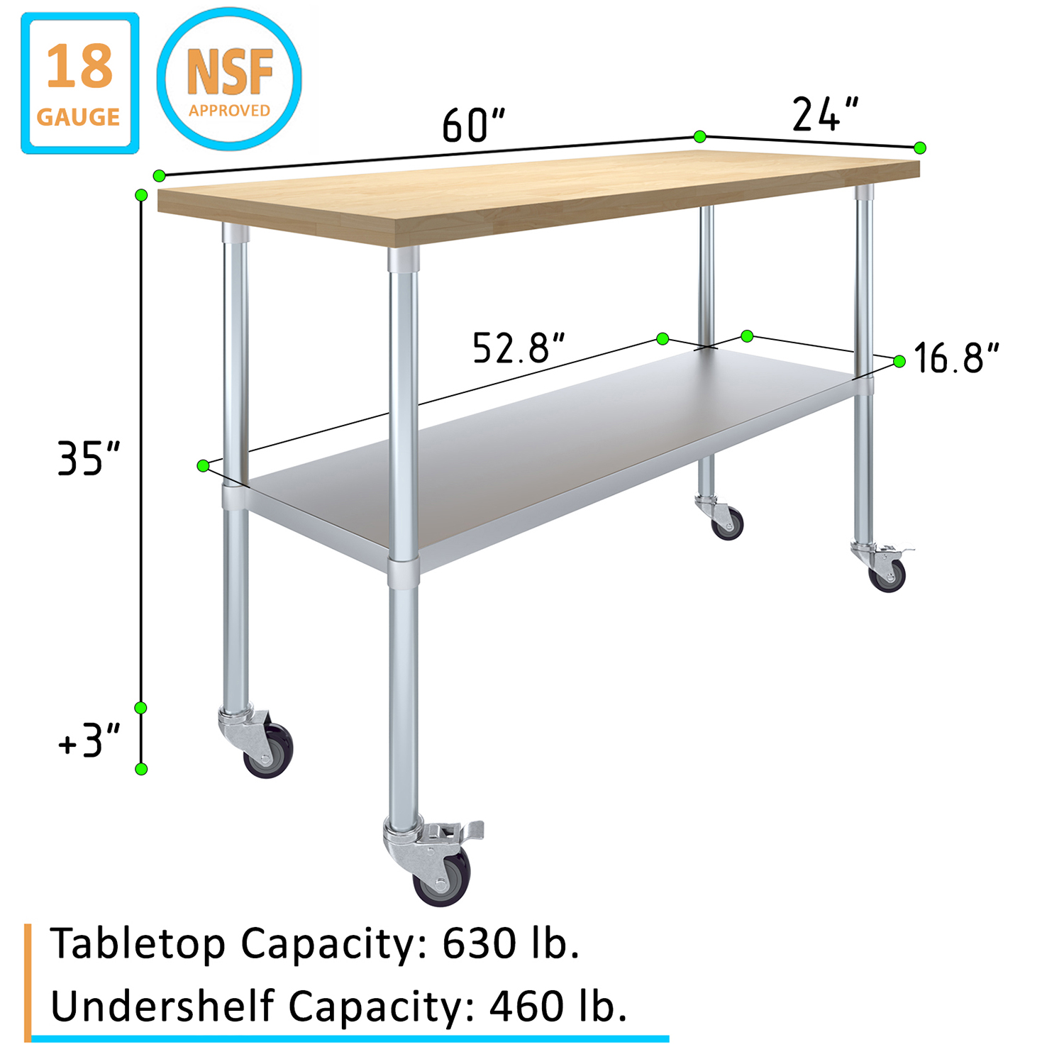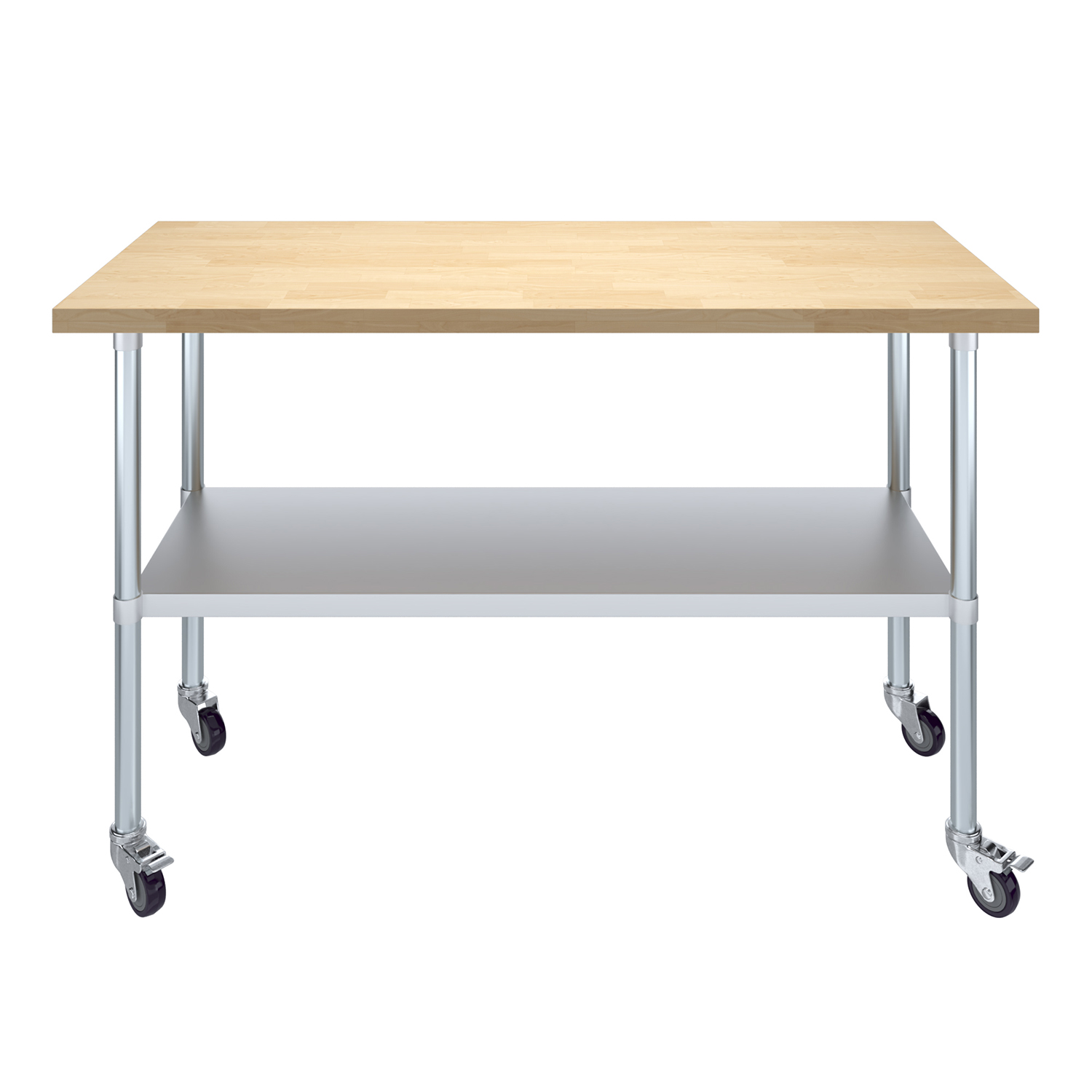 Ideal for both residential and commercial applications, our 24″ x 60″ Maple Wood Top Work Table with Adjustable Undershelf and Wheels is a perfect addition to any workspace. Enhance your kitchen, workshop, or commercial environment with this stylish and practical work table, and experience the benefits of improved organization, efficiency, and mobility. Invest in a quality, versatile work table designed to meet the highest standards of professional use and transform your workspace today.
