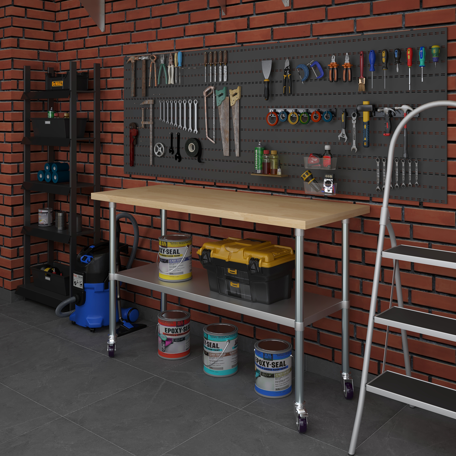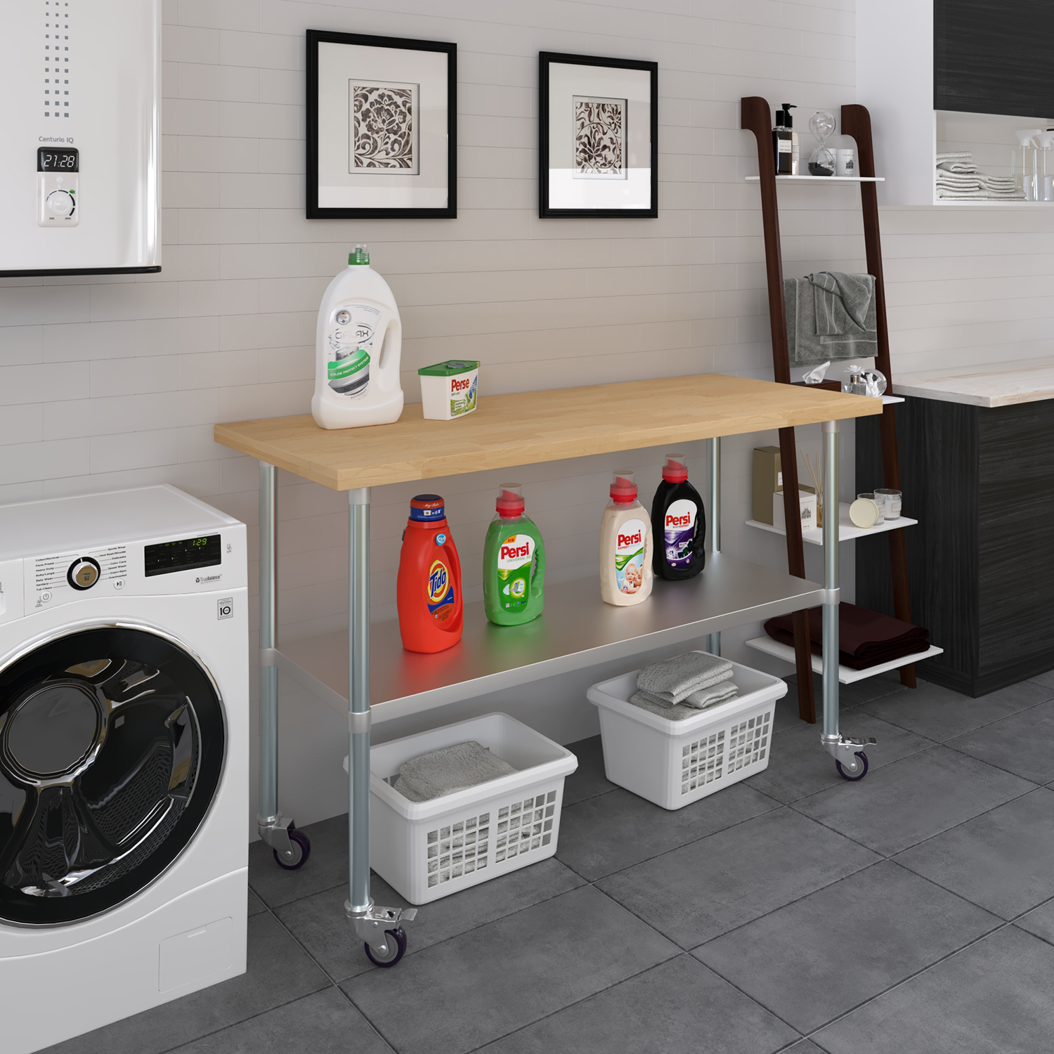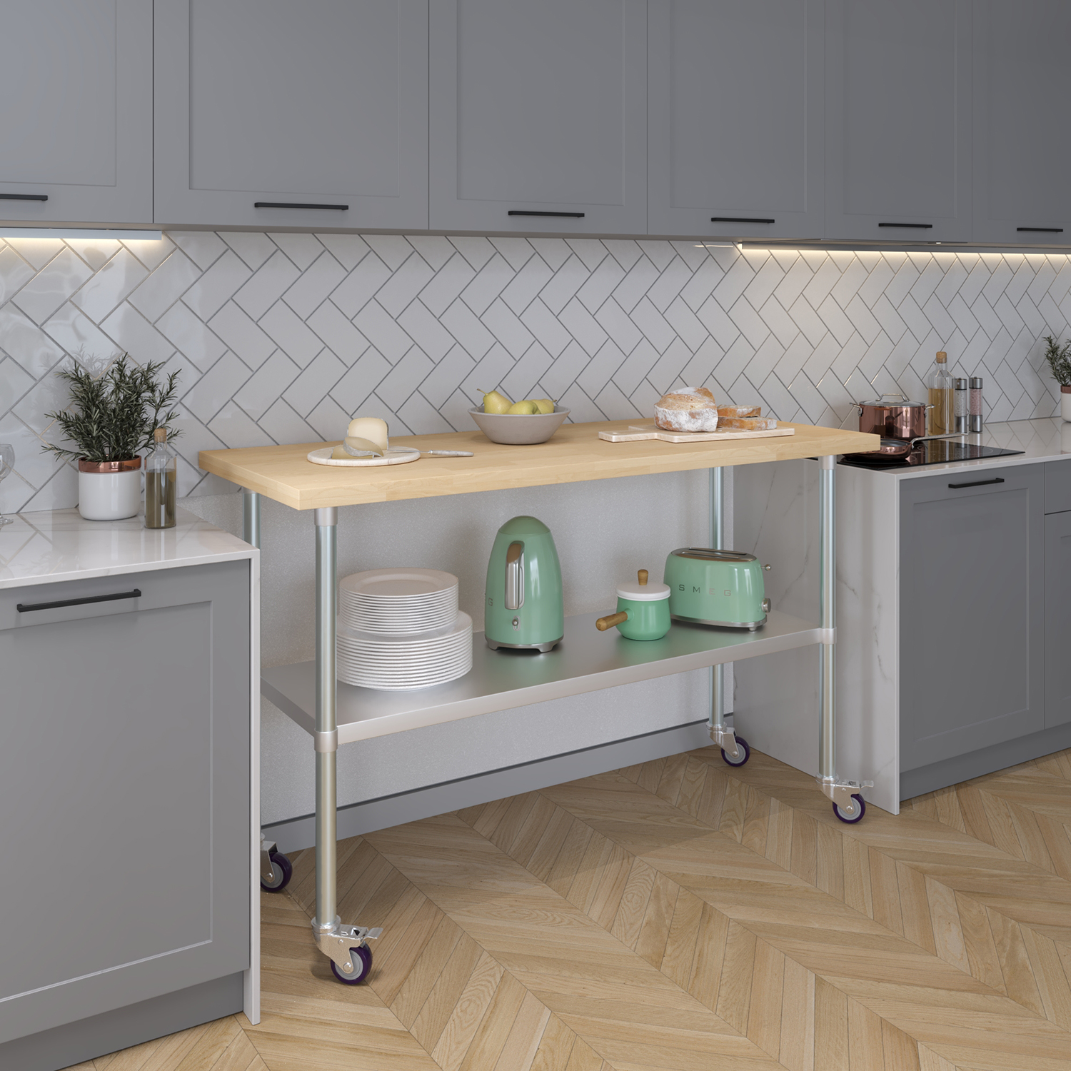 For added convenience, the work table comes with a set of four sturdy wheels, allowing for effortless mobility and repositioning as needed. Whether you need to move the table across the kitchen or reposition it in a workshop, the smooth-rolling wheels make it easy to transport without compromising stability. Two of the wheels are equipped with locking mechanisms, ensuring that the table remains securely in place during use.