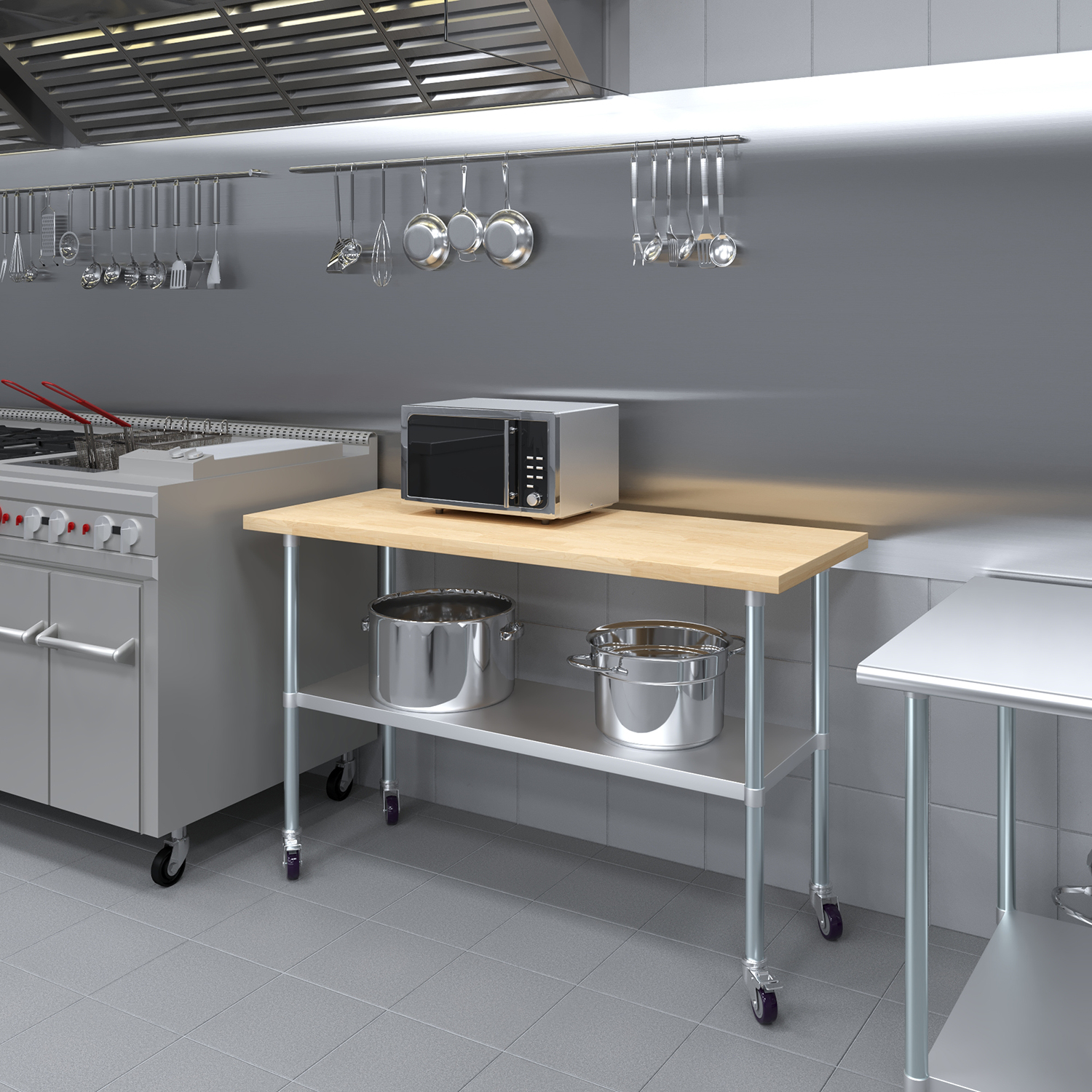 Introducing our 24″ x 60″ Maple Wood Top Work Table with Adjustable Undershelf and Wheels (set of 4), a perfect combination of durability, functionality, and mobility designed to meet the needs of dynamic work environments. This versatile work table features a qualty maple wood top that provides a smooth and sturdy surface, ideal for various tasks such as food preparation, crafting, and assembly work. The natural maple wood not only ensures longevity but also adds a touch of elegance to any setting.