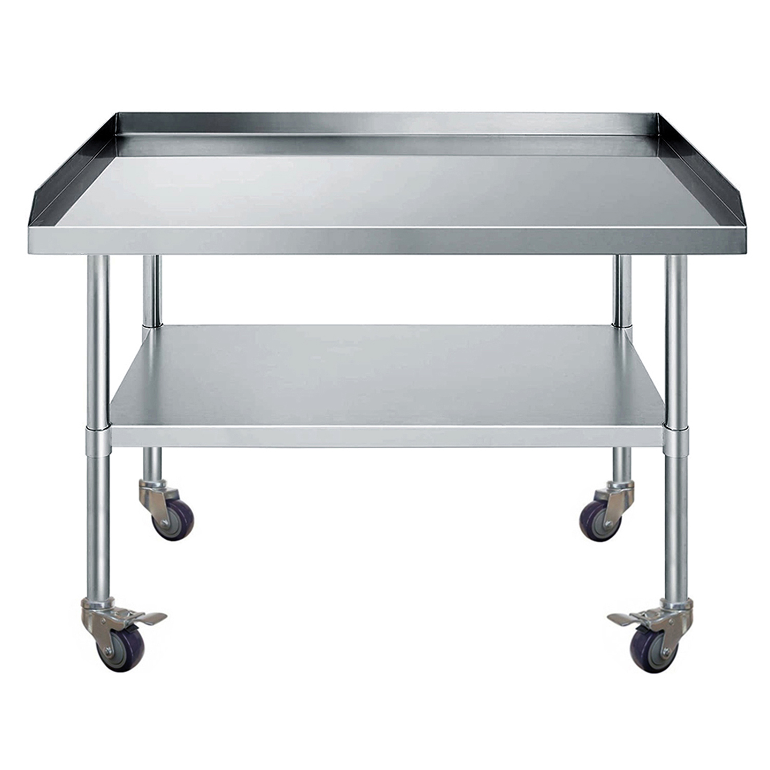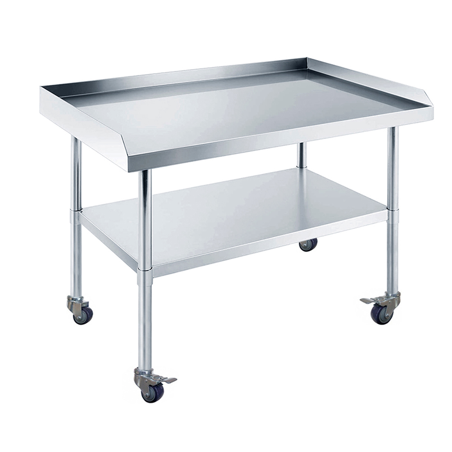 Ideal for commercial kitchens, bakeries, restaurants, and other food service establishments, this stainless steel equipment stand with wheels offers a practical and durable solution for your kitchen needs. Its size fits well in various kitchen layouts, while its sturdy construction ensures reliable performance.
