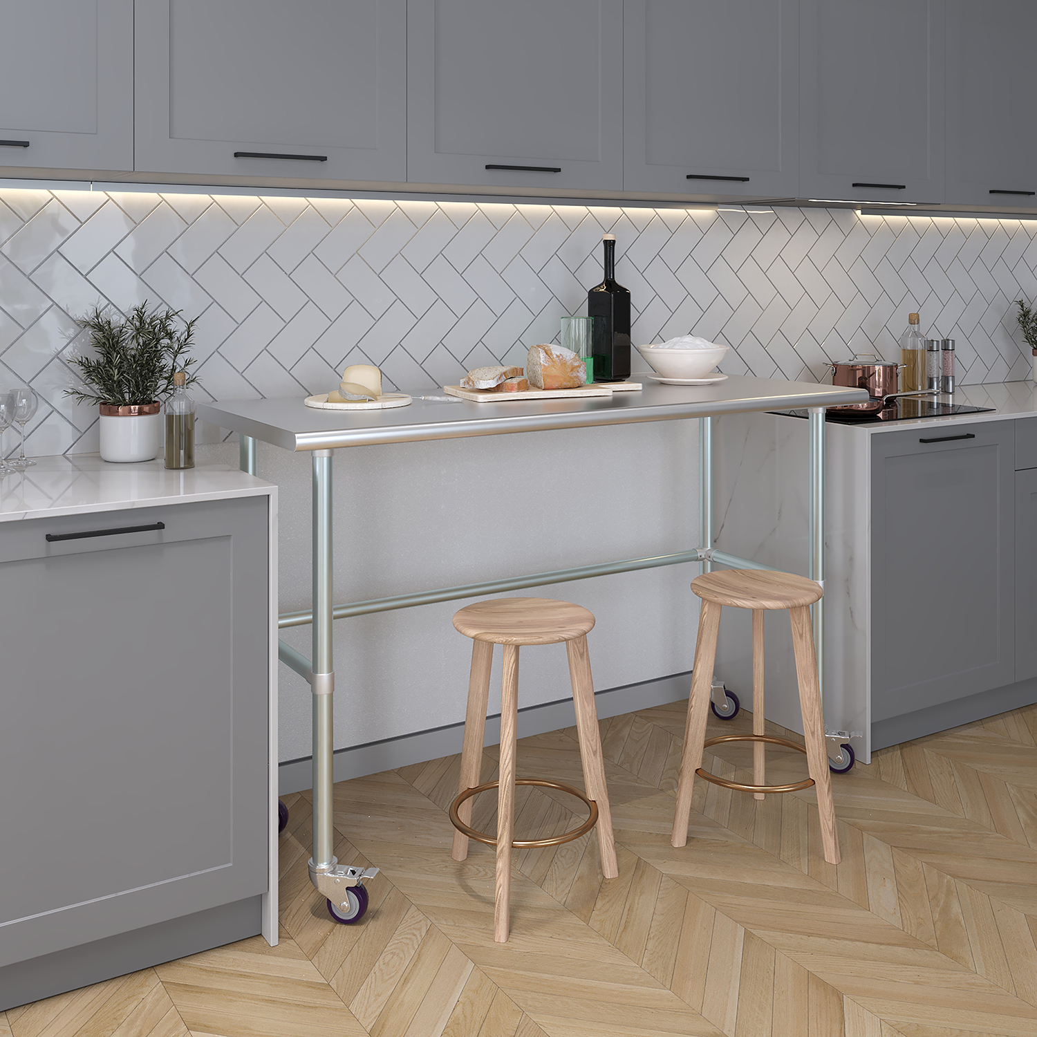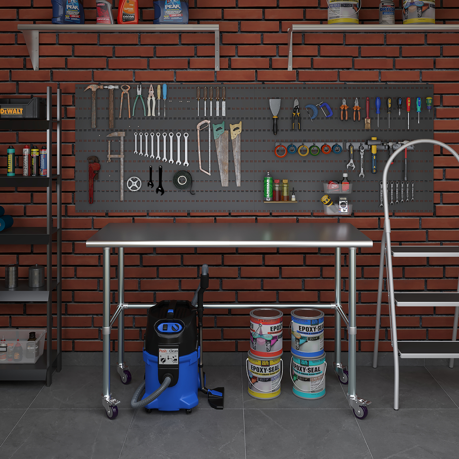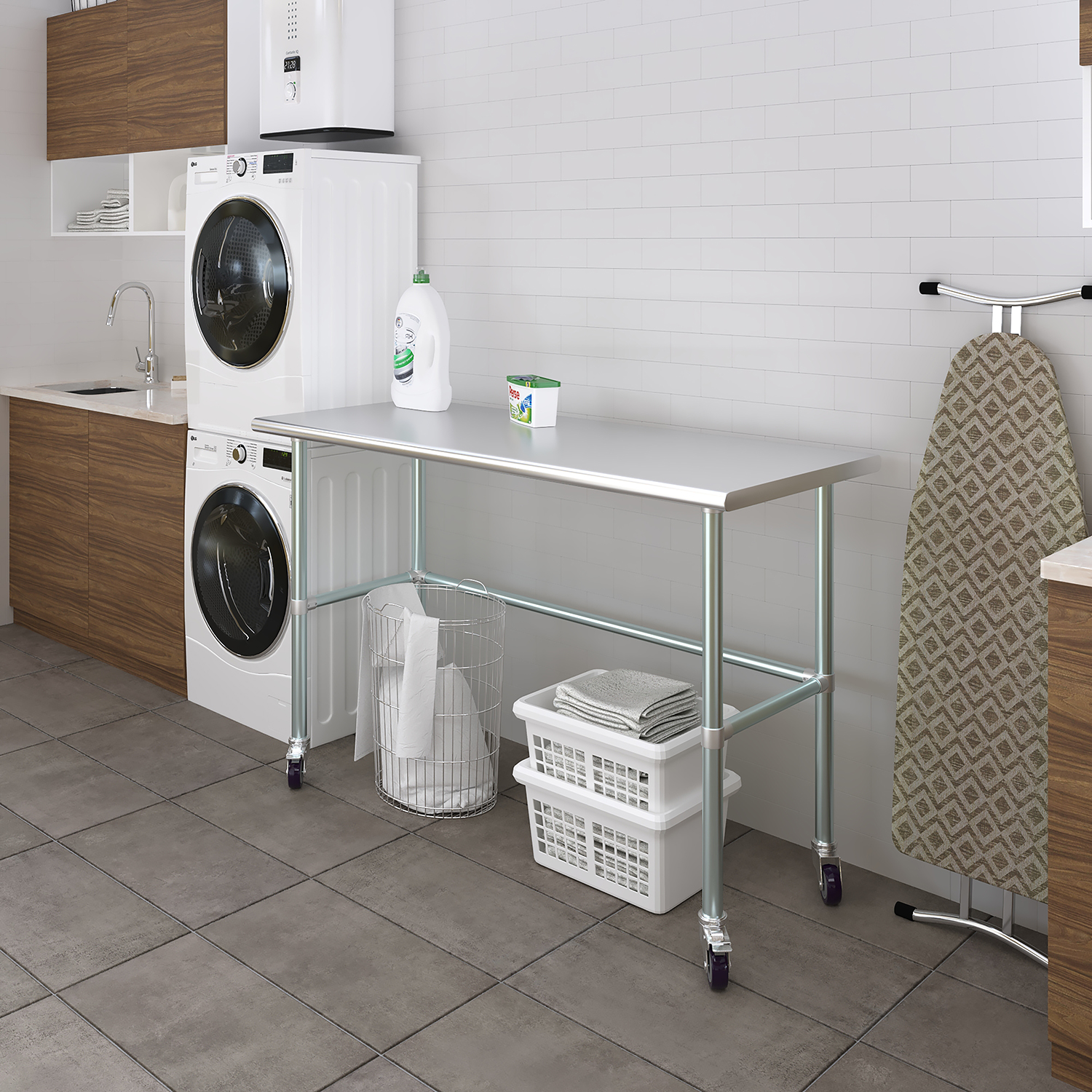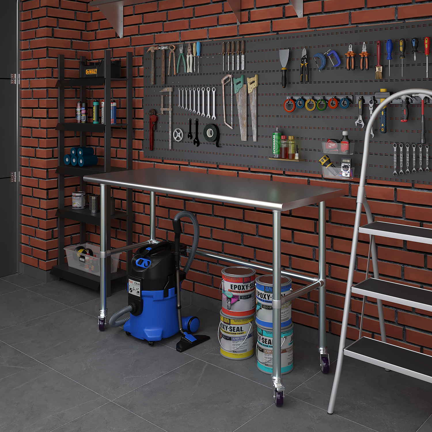 Equipped with a set of four wheels, this work table offers unparalleled mobility. The wheels are designed to glide smoothly across different surfaces, allowing you to reposition the table effortlessly as needed. This mobility is particularly beneficial in dynamic environments where flexibility and adaptability are crucial. Additionally, the wheels are equipped with locking mechanisms to ensure stability and prevent unwanted movement during use.