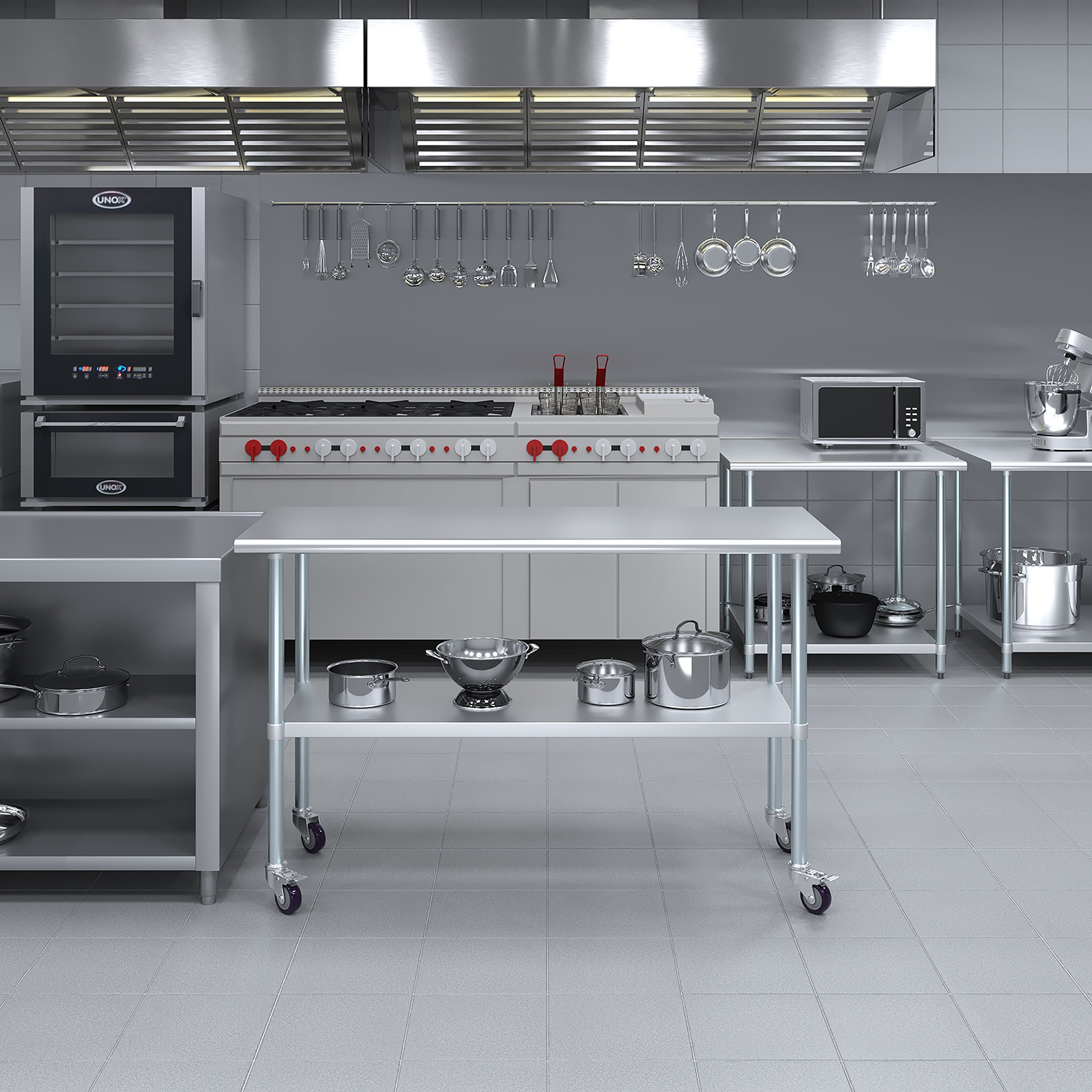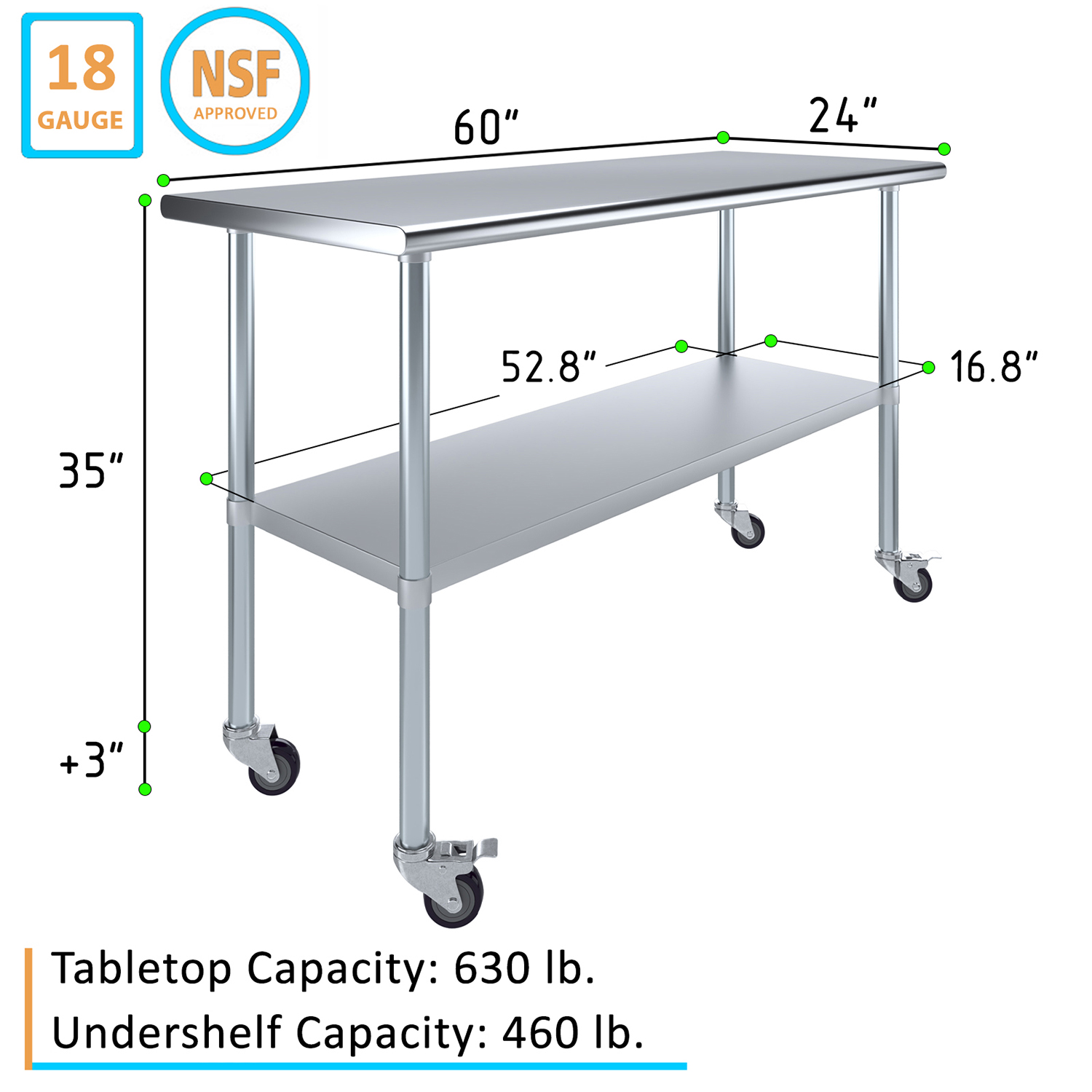 Optimize your workspace with the 24″ x 60″ Stainless Steel Work Table featuring an undershelf and a set of four wheels for enhanced mobility and storage. This work table is constructed from 18GA/430 stainless steel, ensuring a durable, easy-to-clean surface. Designed for demanding environments such as commercial kitchens, laboratories, and workshops, this table guarantees long-lasting performance and reliability.