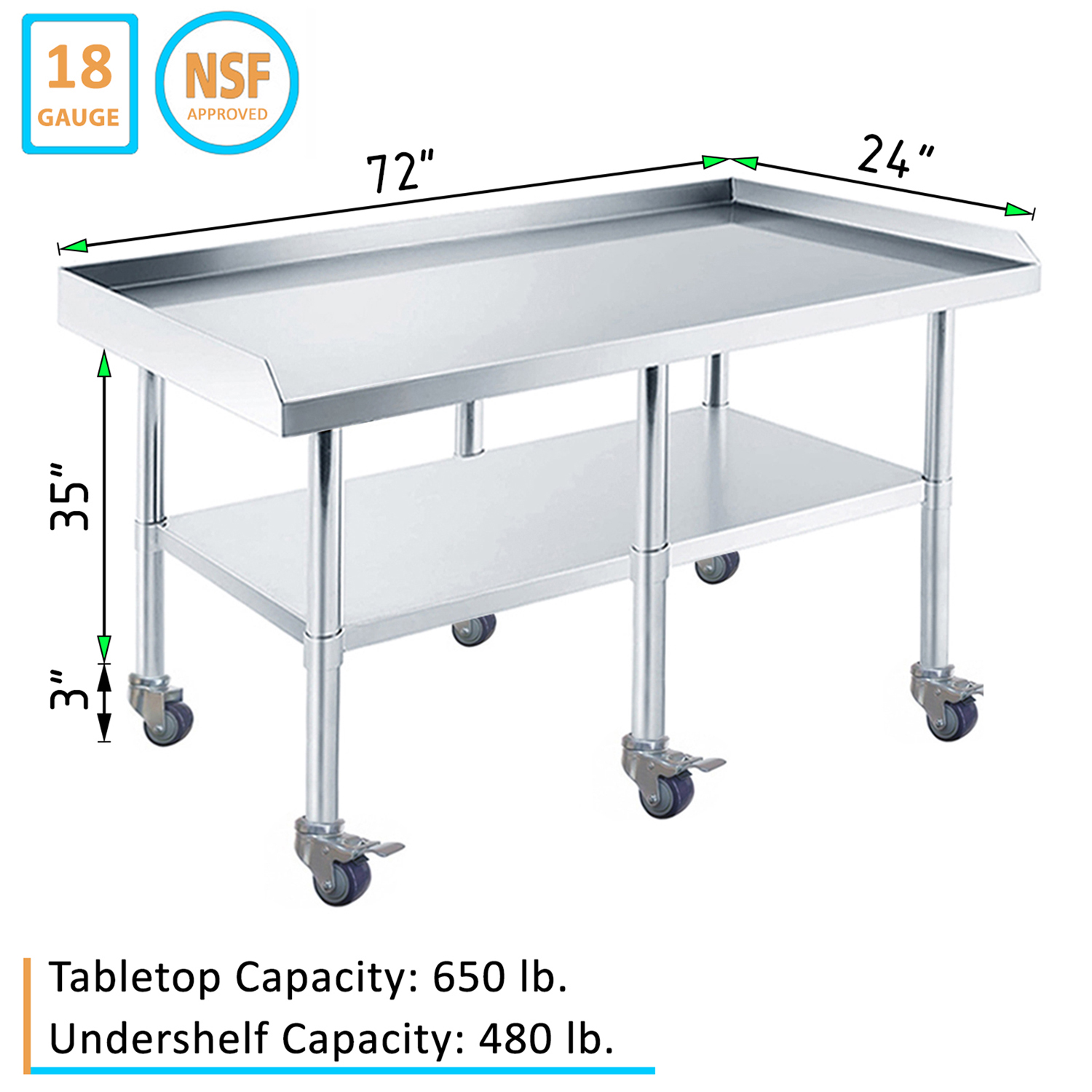 Enhance your kitchen’s efficiency and mobility with our 24″ x 72″ Stainless Steel Equipment Stand, designed with a set of six robust wheels for effortless movement. Constructed from 18GA/430 stainless steel, making it ideal for heavy-duty kitchen equipment such as mixers, slicers, and grinders. The durable construction ensures longevity and stability, while the sleek, polished finish adds a professional touch to any culinary workspace.