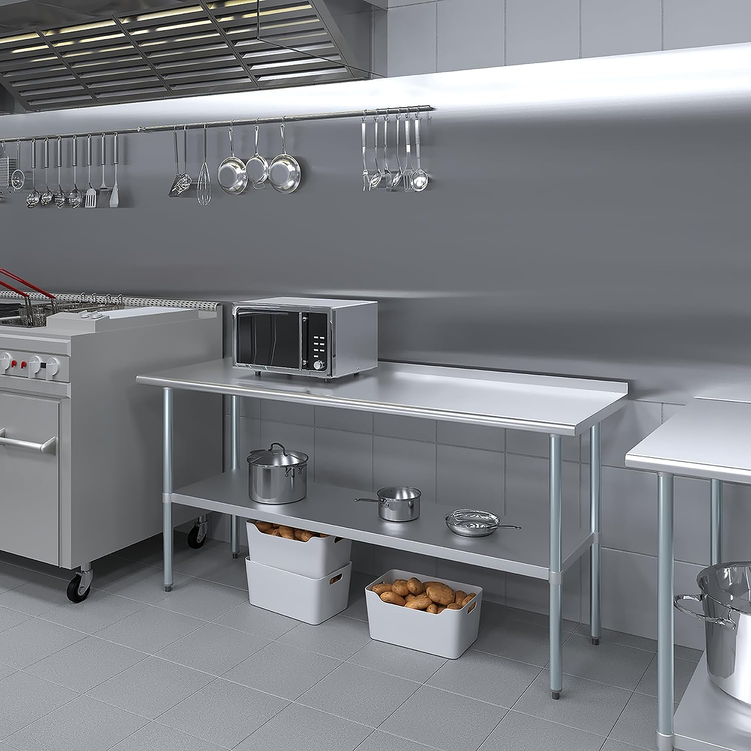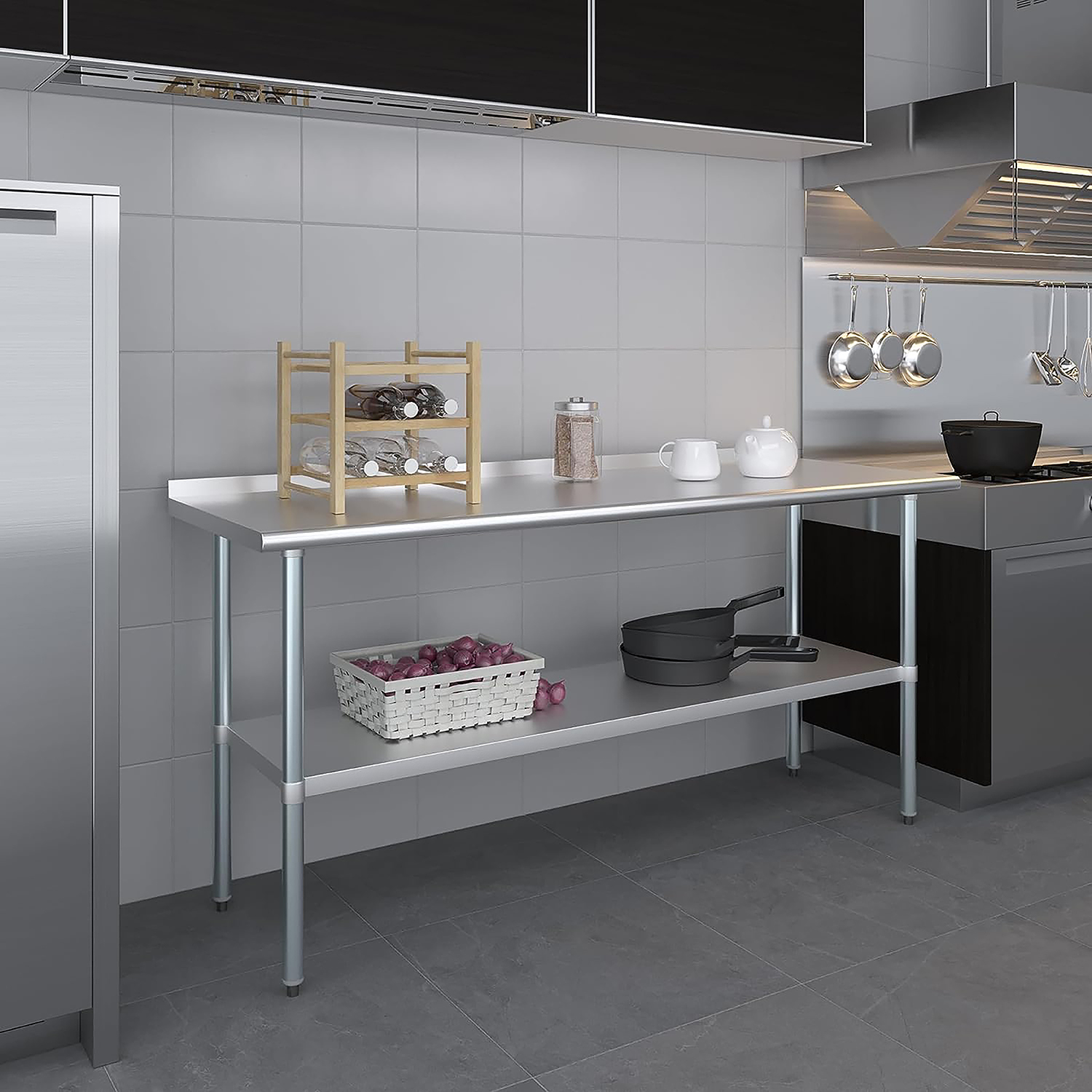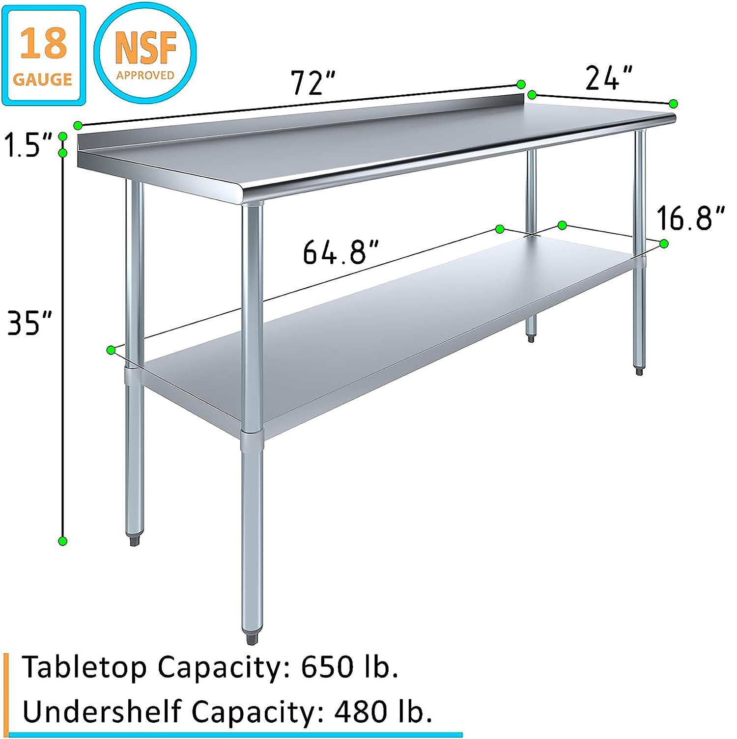 The 1.5″ backsplash is an essential feature, helping to contain spills and splashes, thus protecting your walls and maintaining a tidy and sanitary work area. This makes the table especially suitable for food preparation, as well as other tasks where cleanliness is paramount.