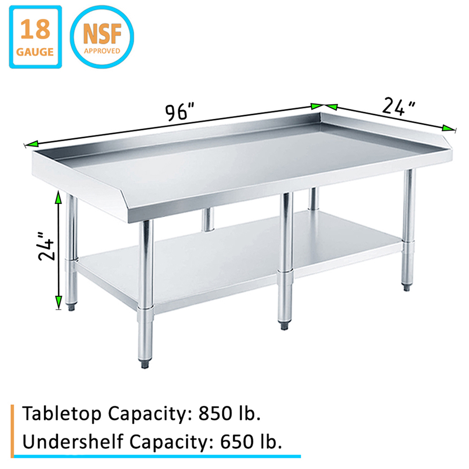 Maximize your kitchen efficiency and organization with our 24″ x 96″ Stainless Steel Equipment Stand. This robust stand is perfect for holding mixers, slicers, and other heavy-duty kitchen equipment, providing a stable and reliable workspace. The stainless steel construction not only ensures long-lasting durability but also offers a sleek, modern appearance that enhances any commercial kitchen setting.
