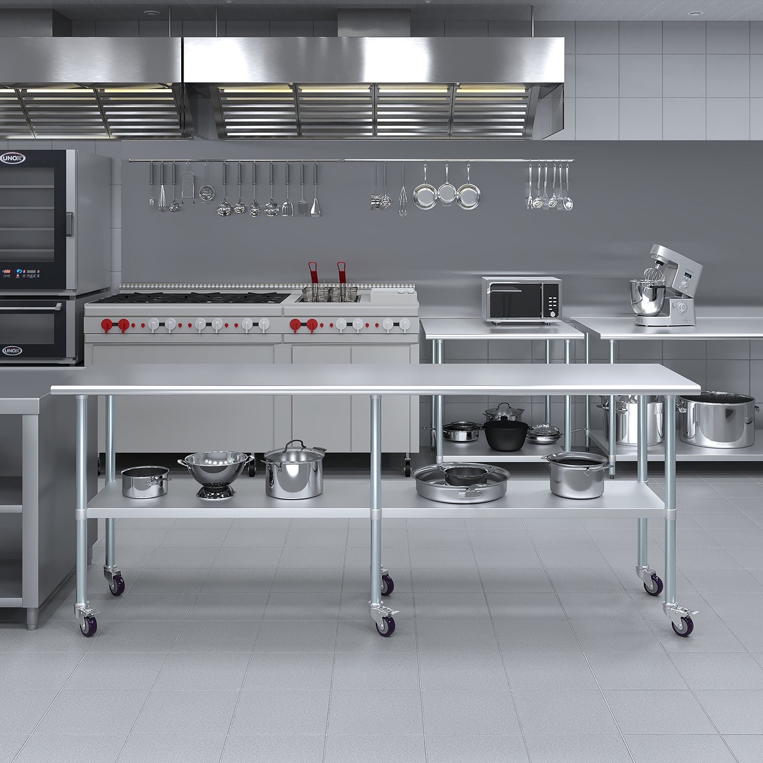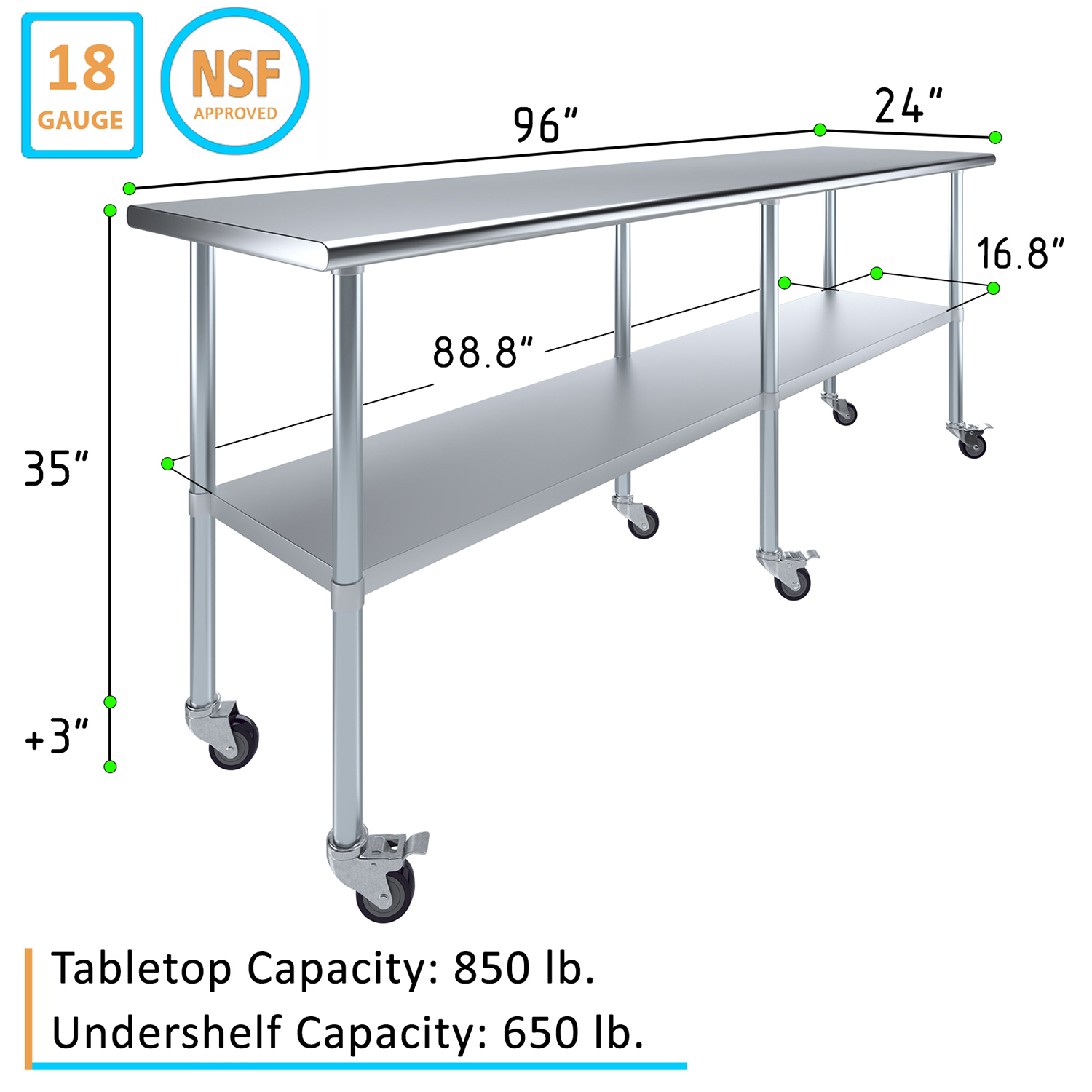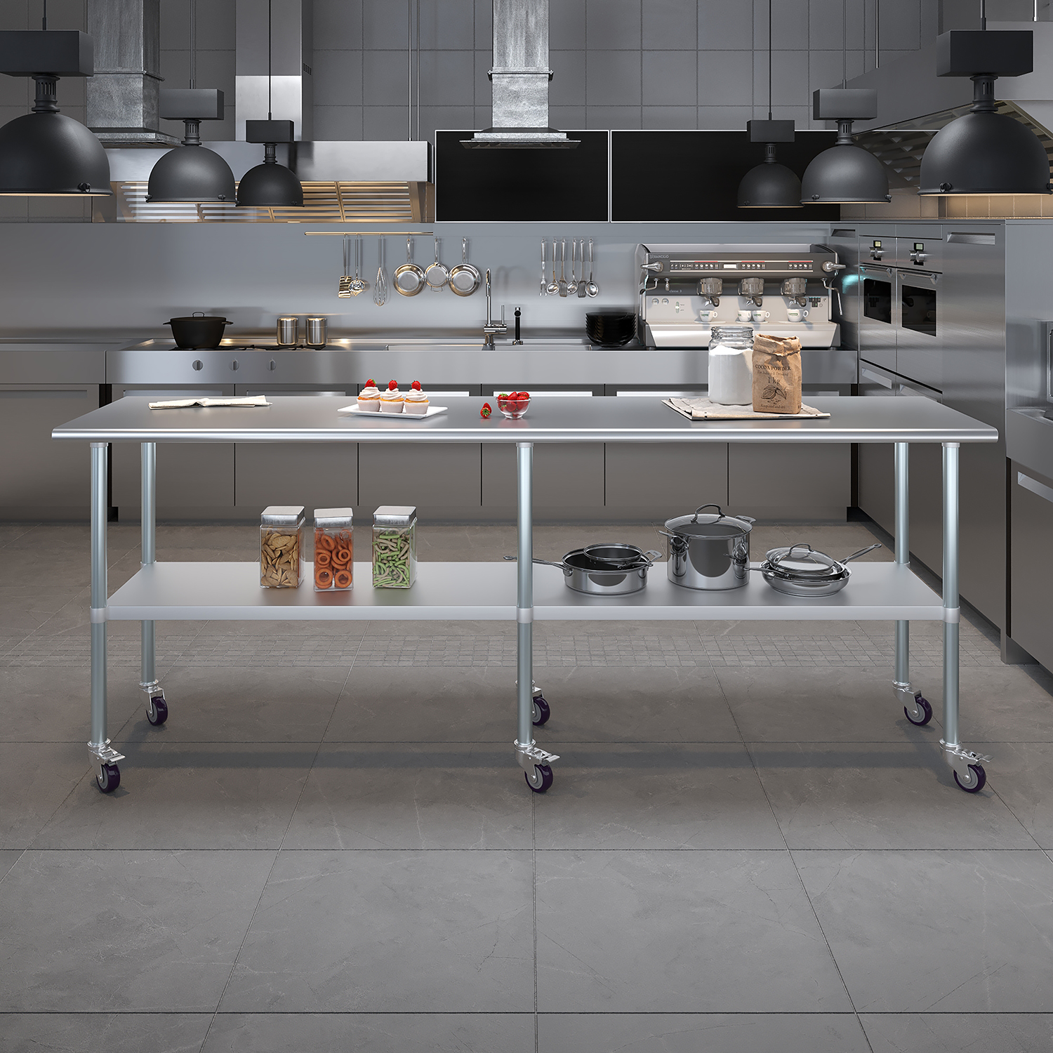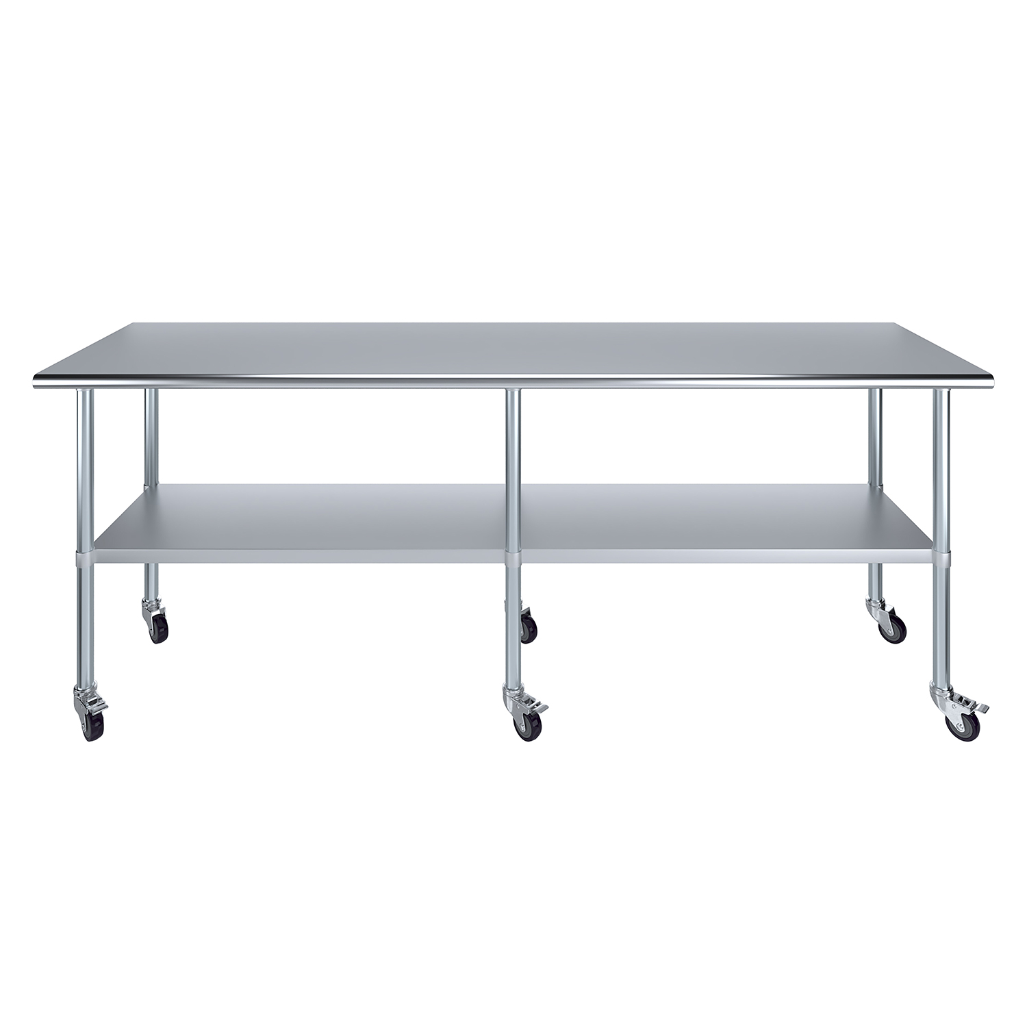 Optimize your workspace with the 24″ x 96″ Stainless Steel Work Table featuring an undershelf and a set of six wheels for enhanced mobility and storage. This work table is constructed from 18GA/430 stainless steel, ensuring a durable, easy-to-clean surface. Designed for demanding environments such as commercial kitchens, laboratories, and workshops, this table guarantees long-lasting performance and reliability.