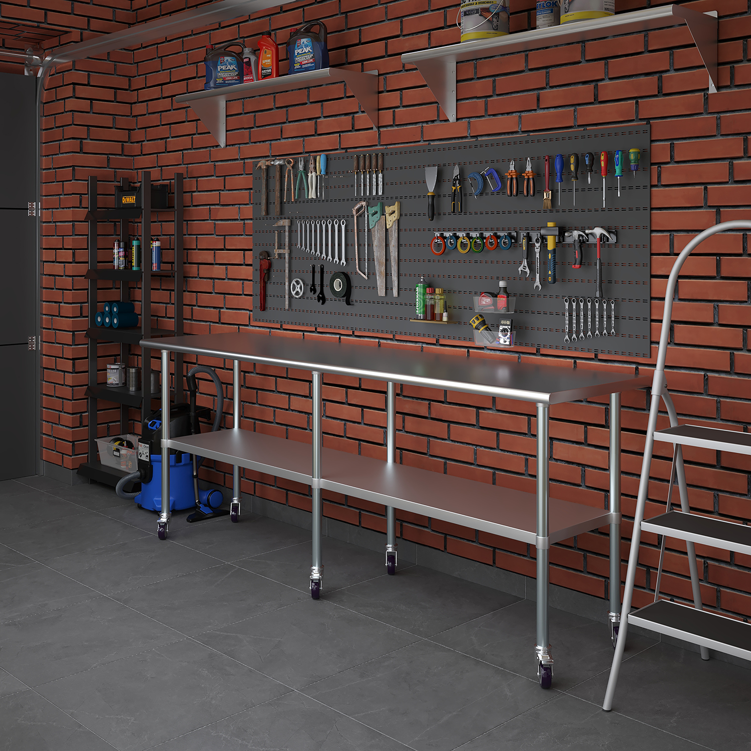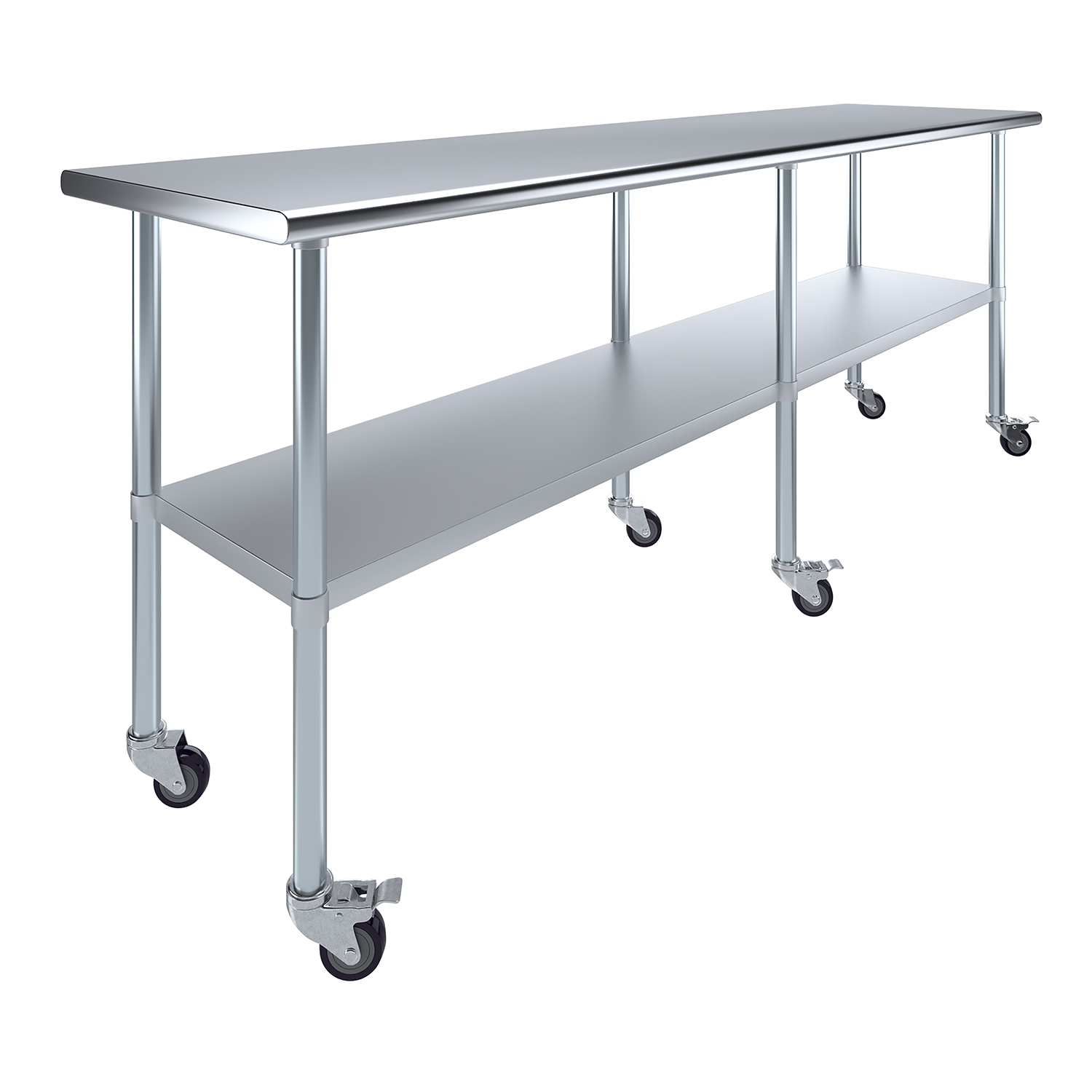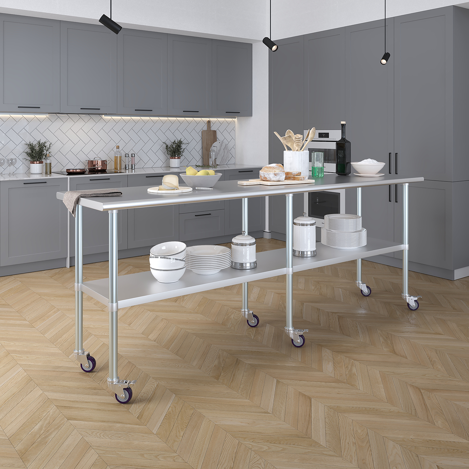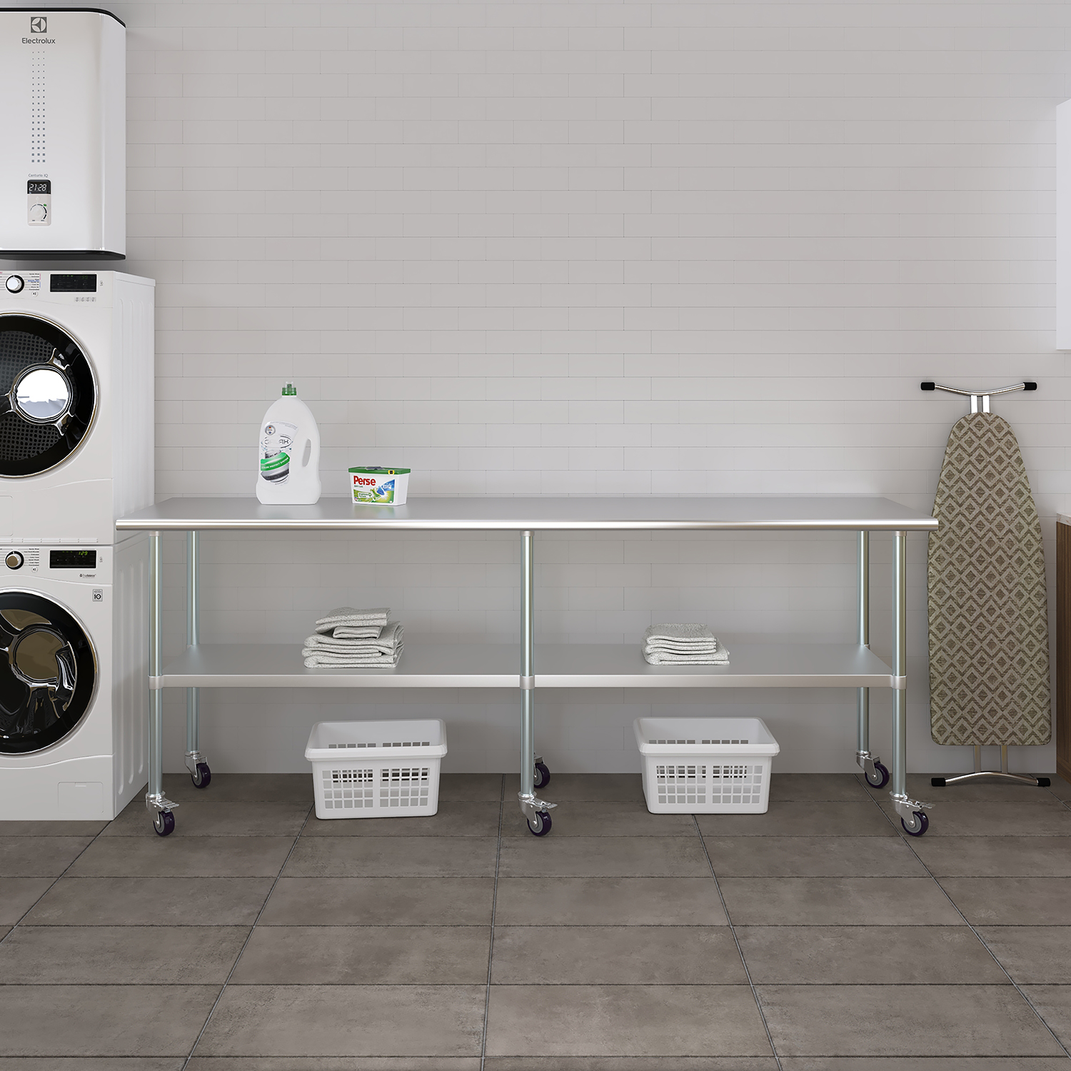 Optimize your workspace with the 24″ x 96″ Stainless Steel Work Table featuring an undershelf and a set of six wheels for enhanced mobility and storage. This work table is constructed from 18GA/430 stainless steel, ensuring a durable, easy-to-clean surface. Designed for demanding environments such as commercial kitchens, laboratories, and workshops, this table guarantees long-lasting performance and reliability.