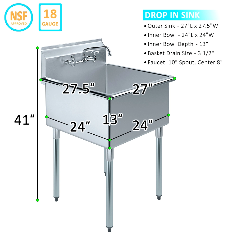 Elevate your workspace with the 27 in. x 27 1/2 in. Stainless Steel Utility Sink with Faucet, designed for durability, functionality, and convenience. Crafted from 18GA/304 stainless steel, this utility sink is built to withstand heavy use in demanding environments such as commercial kitchens, garages, workshops, and laundry rooms. Its corrosion-resistant construction ensures long-lasting performance while maintaining a sleek, professional appearance.