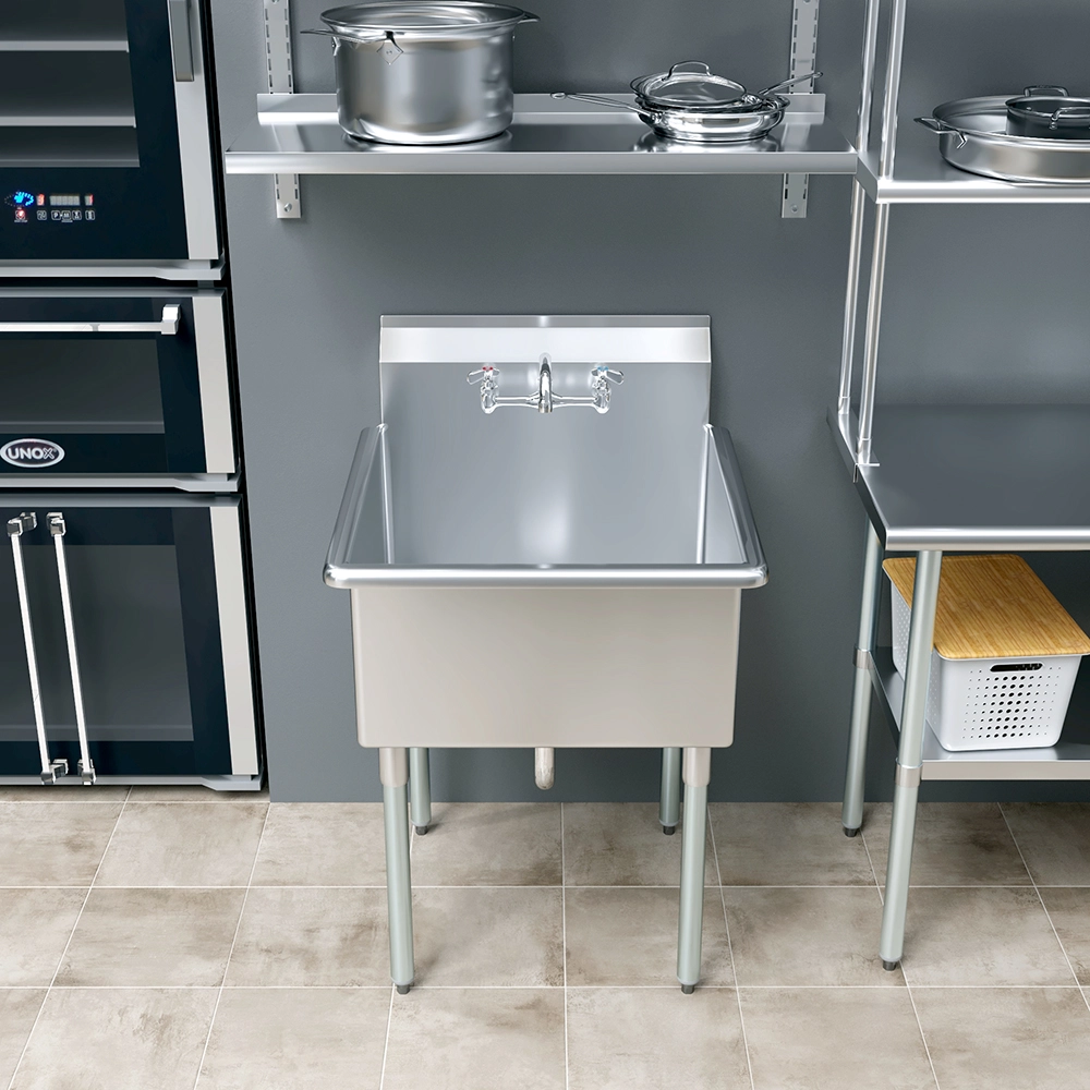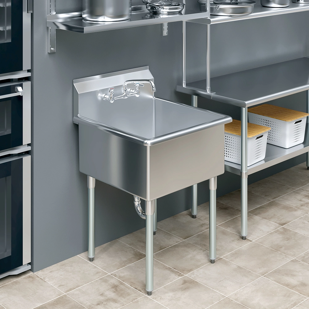 The stainless steel surface is not only sturdy but also easy to clean, promoting hygiene and simplifying maintenance. Its modern, polished finish complements various decor styles, blending seamlessly into any environment. The reinforced construction and stable base ensure that the sink remains secure during use, providing peace of mind in busy settings.