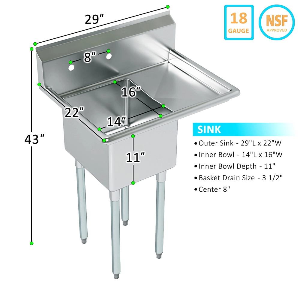 Streamline your workspace with the 29 in. x 22 in. Stainless Steel One-Compartment Sink with a 12 in. right drainboard, a practical and durable solution for various cleaning and prep needs. Crafted from 18GA/304 stainless steel, this sink resists corrosion and stains, ensuring long-lasting performance even in demanding environments like commercial kitchens, utility rooms, or workshops.