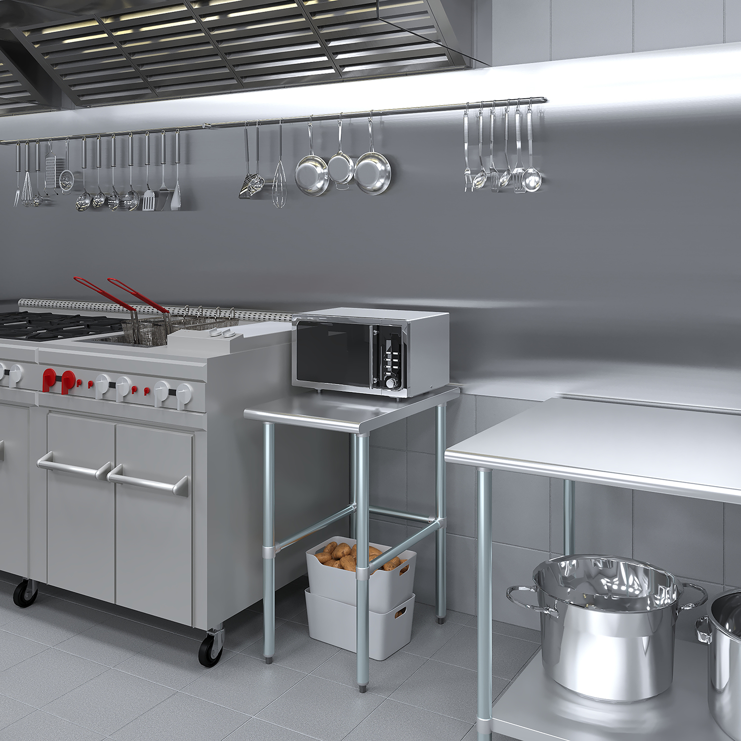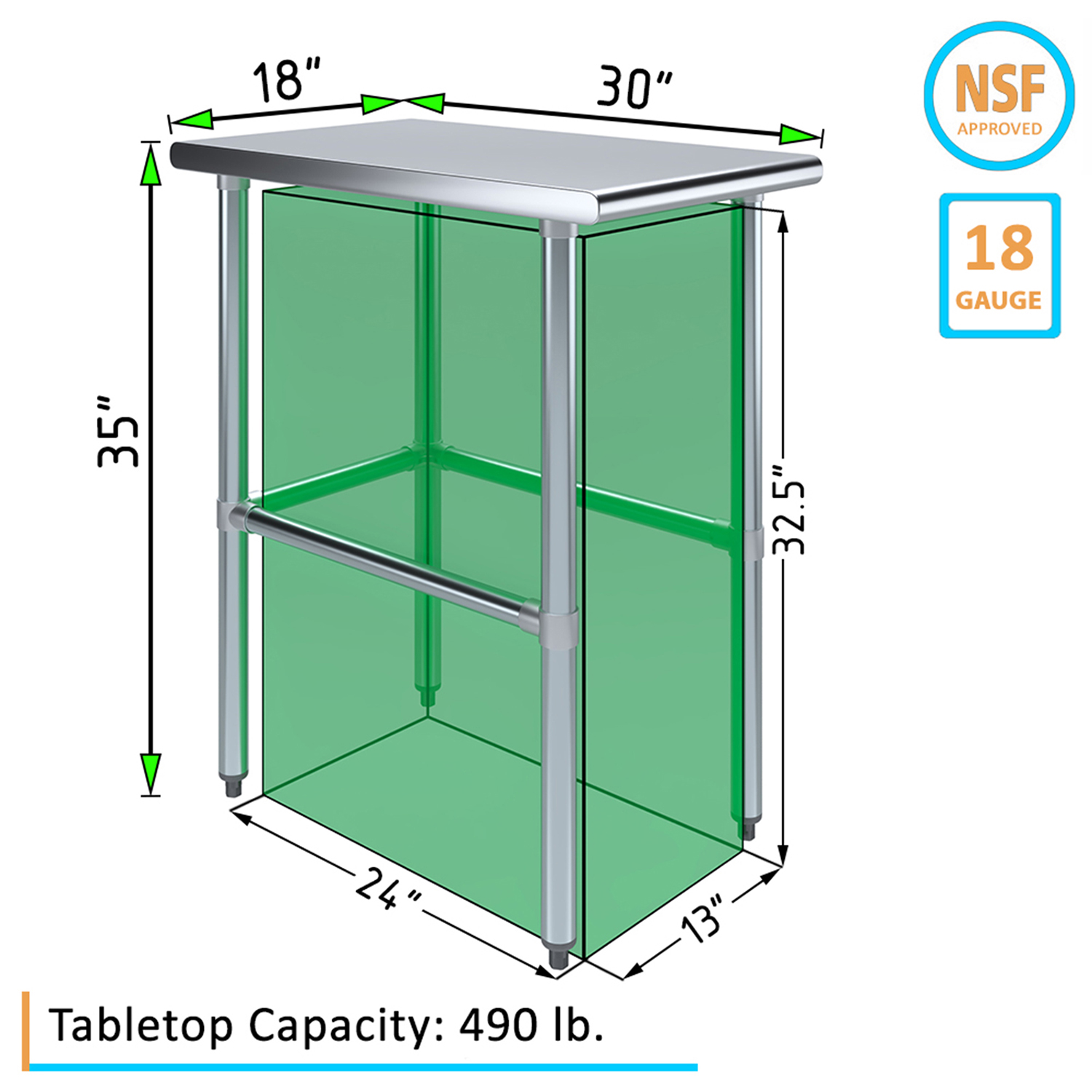 Enhance your workspace with the versatile and durable 30″ x 18″ Stainless Steel Work Table with Open Base. Crafted from 18GA/430 stainless steel, this work table is designed to withstand the rigors of daily use in commercial kitchens, workshops, laboratories, and other demanding environments. Its sleek, smooth surface is not only easy to clean but also resistant, ensuring long-lasting performance and hygiene.