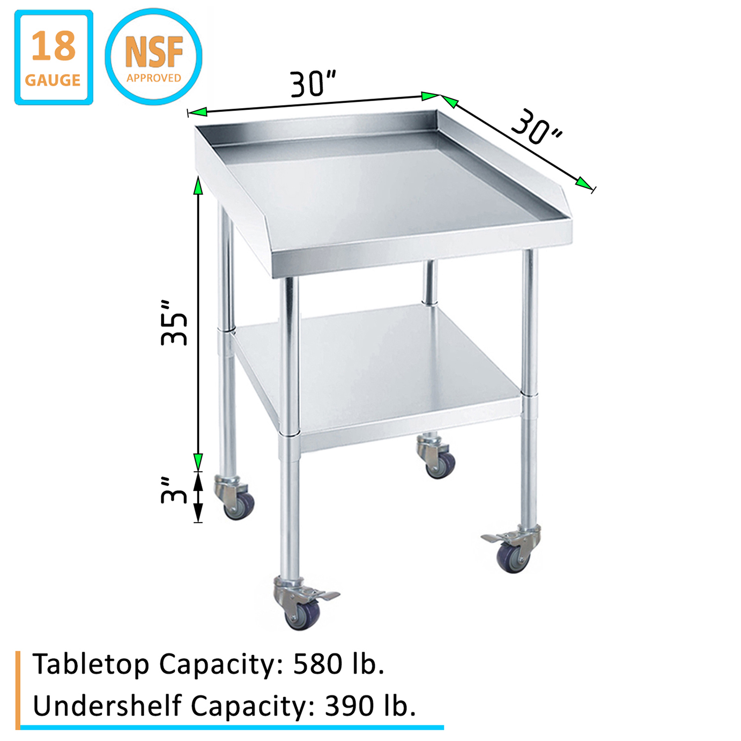 Enhance your kitchen’s efficiency and mobility with our 30″ x 30″ Stainless Steel Equipment Stand, designed with a set of four robust wheels for effortless movement. Constructed from 18GA/430 stainless steel, making it ideal for heavy-duty kitchen equipment such as mixers, slicers, and grinders. The durable construction ensures longevity and stability, while the sleek, polished finish adds a professional touch to any culinary workspace.