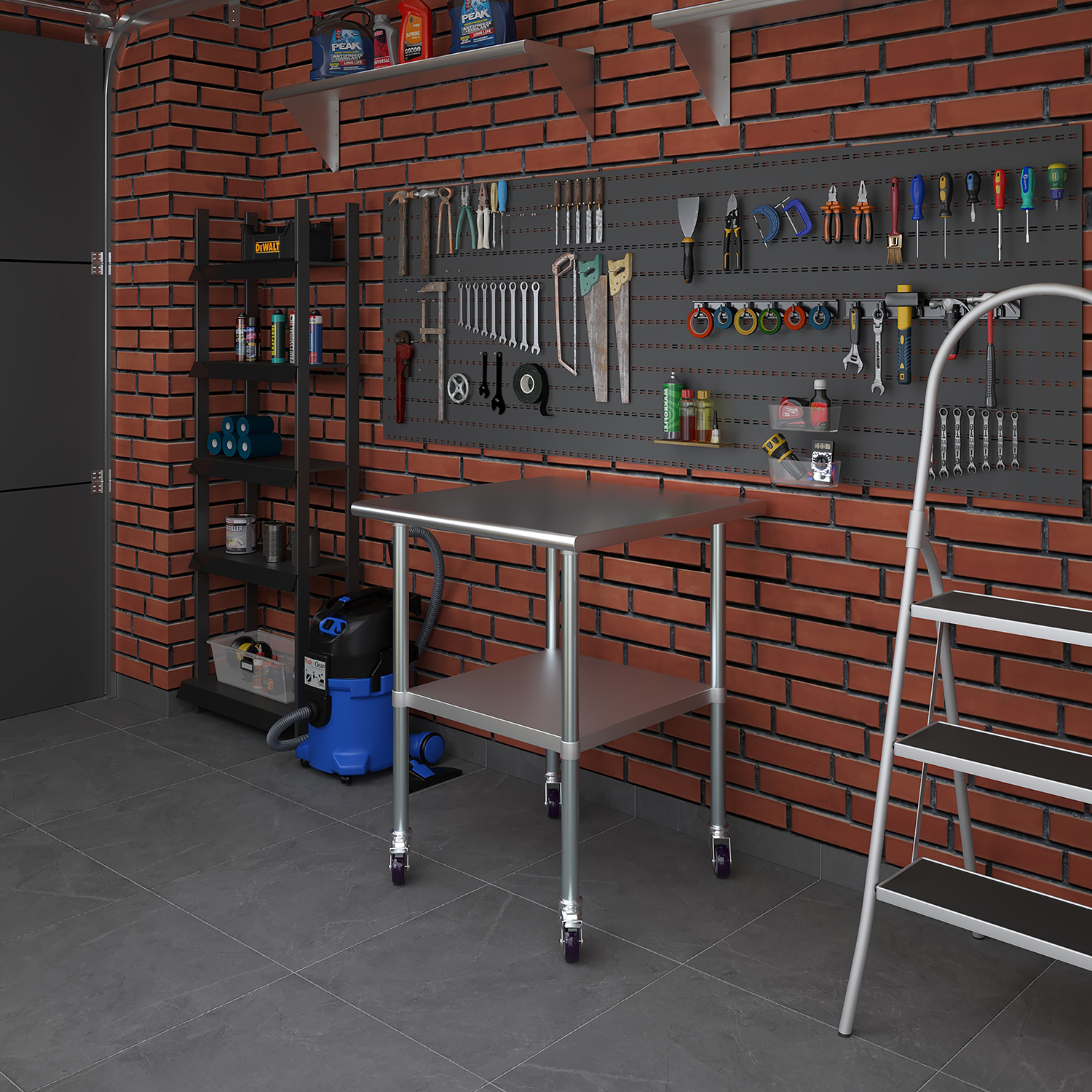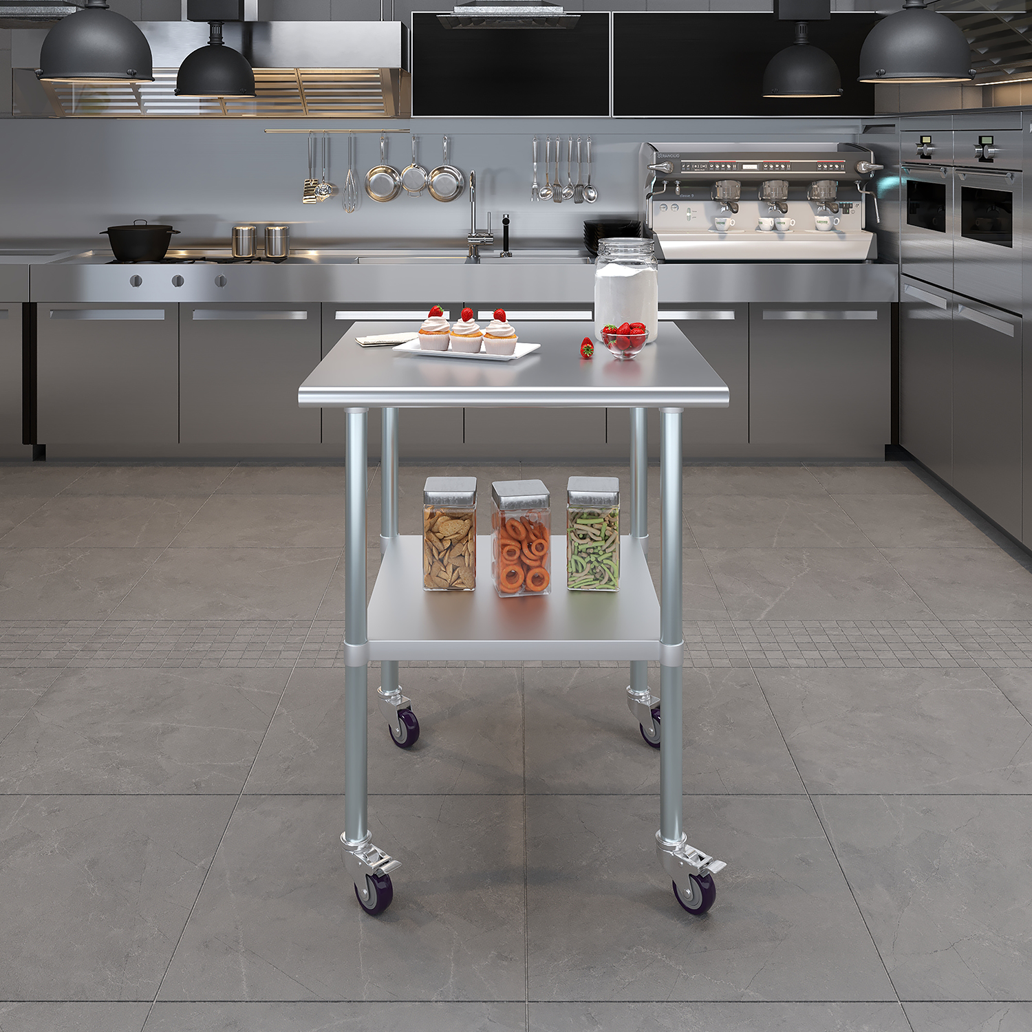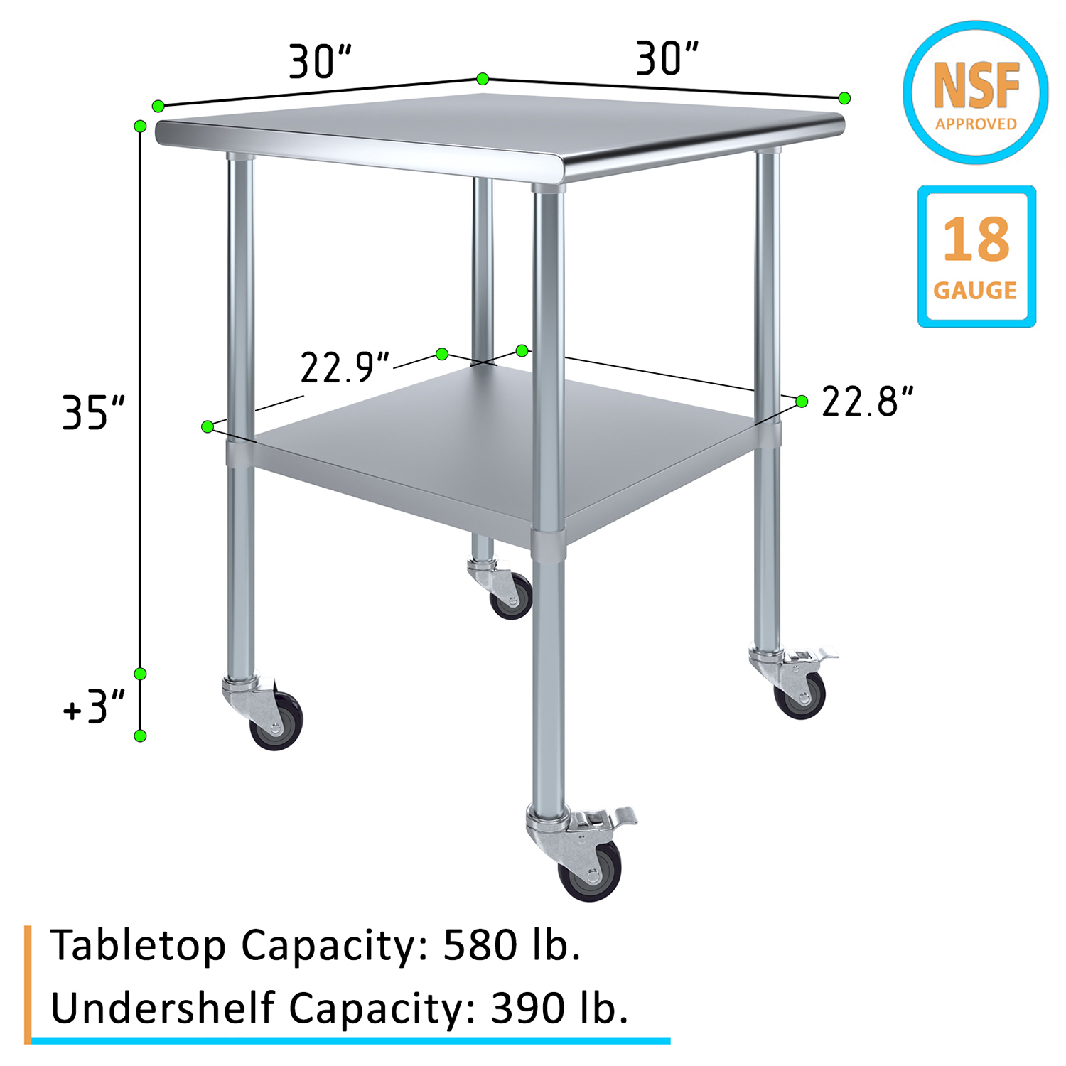 Optimize your workspace with the 30″ x 30″ Stainless Steel Work Table featuring an undershelf and a set of four wheels for enhanced mobility and storage. This work table is constructed from 18GA/430 stainless steel, ensuring a durable, easy-to-clean surface. Designed for demanding environments such as commercial kitchens, laboratories, and workshops, this table guarantees long-lasting performance and reliability.