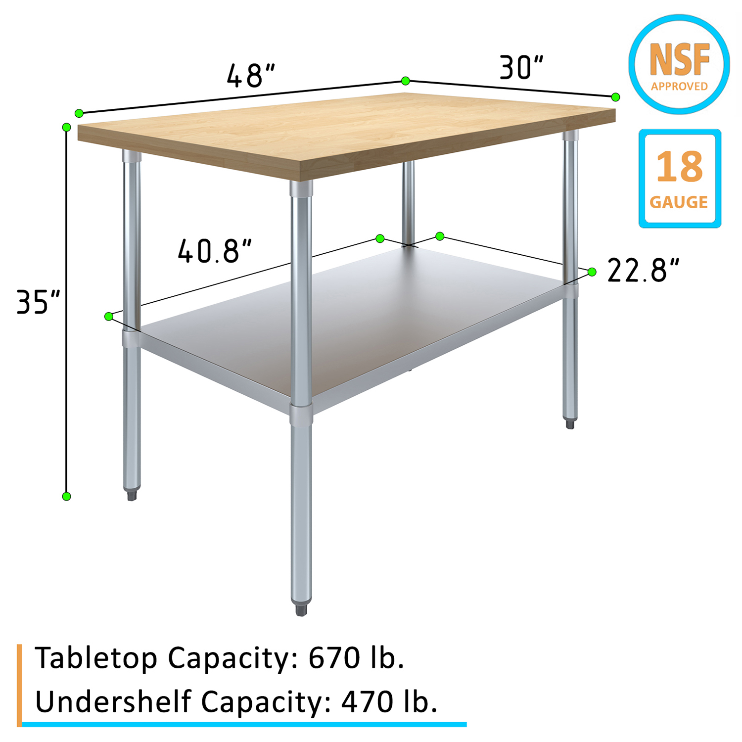 Introducing our 30″ x 48″ Maple Wood Top Work Table with Adjustable Undershelf, the perfect blend of functionality, durability, and style. Designed to meet the demands of busy kitchens, workshops, and commercial environments, this work table features a premium maple wood top that provides a smooth, sturdy surface ideal for a wide range of tasks, from food preparation to crafting and assembly work.