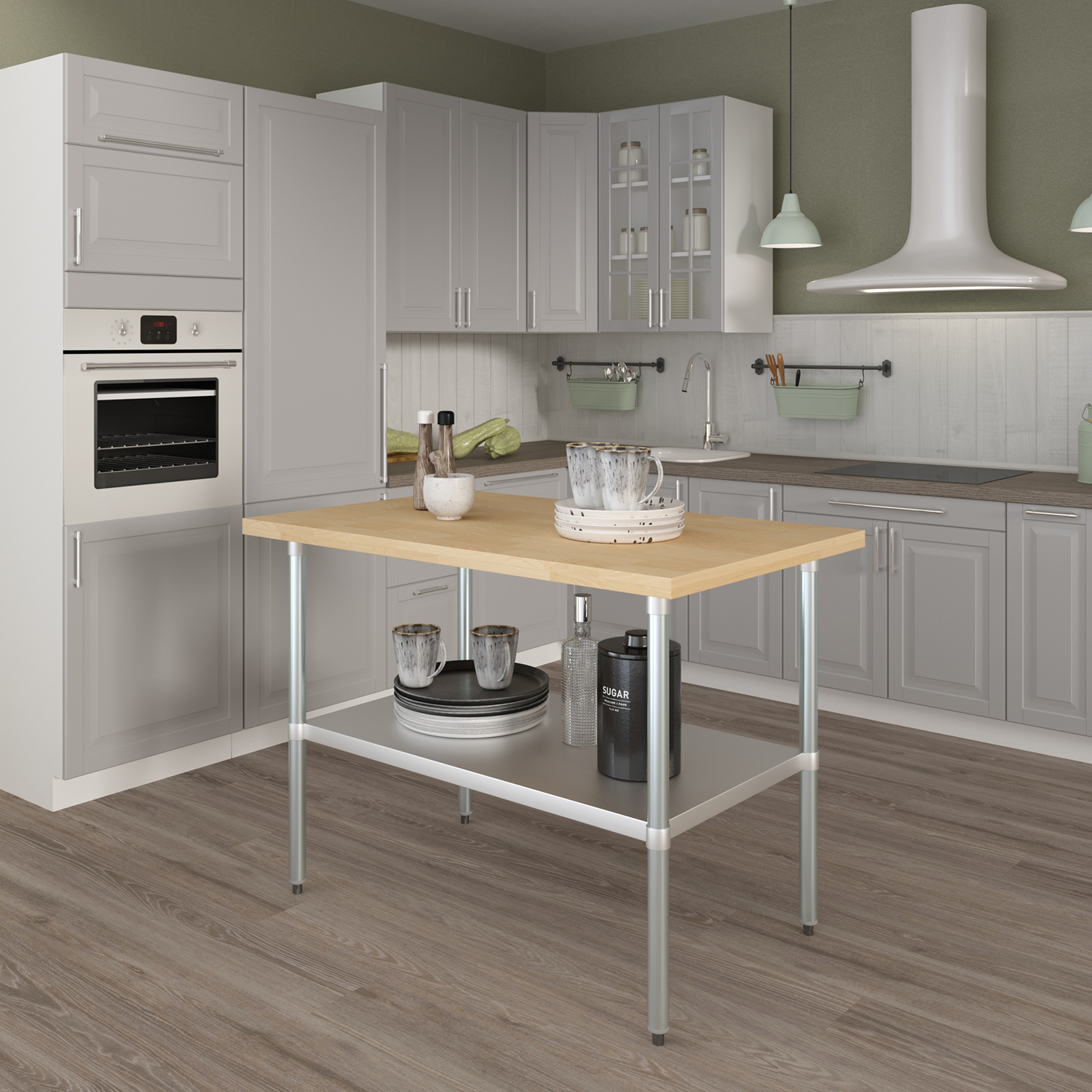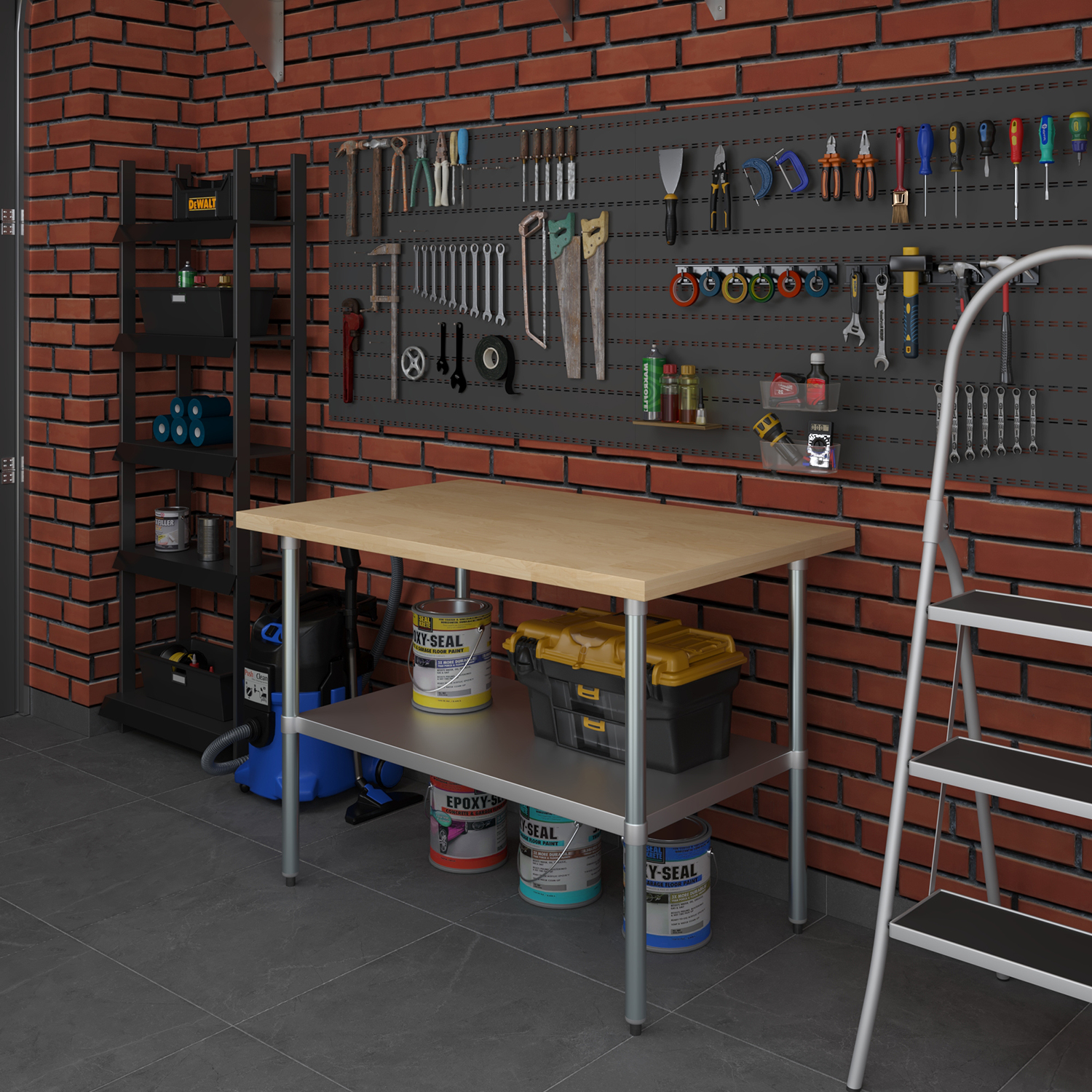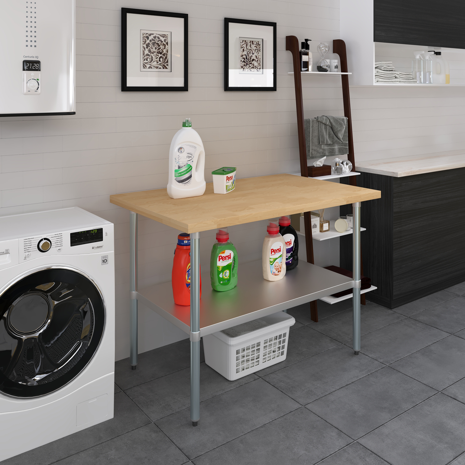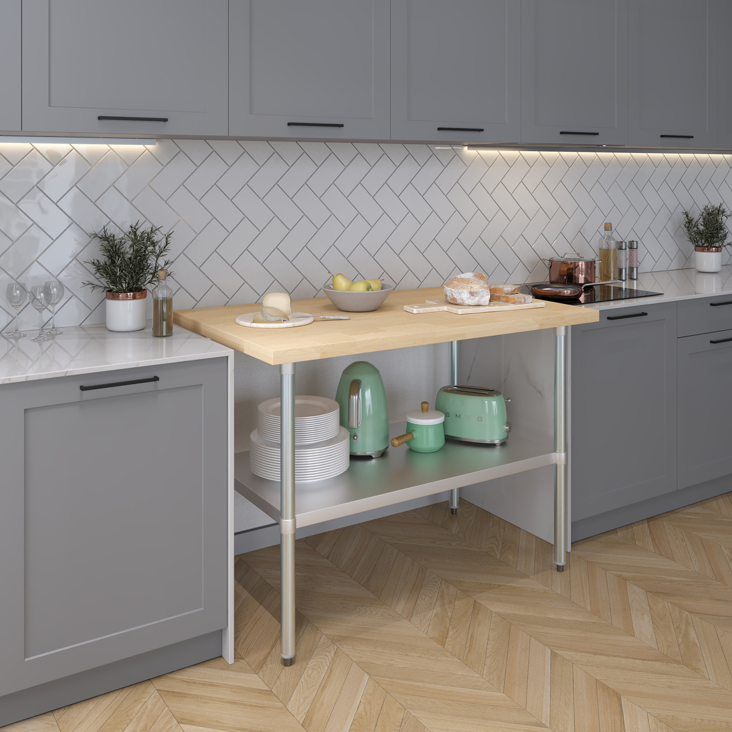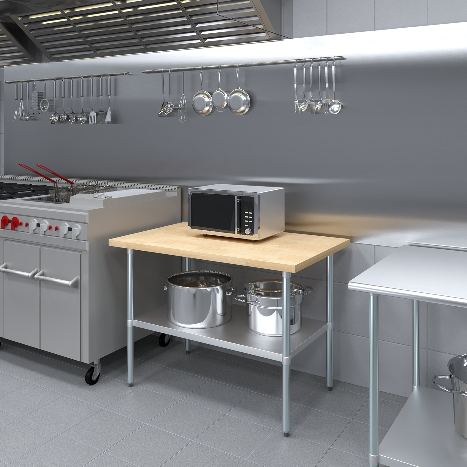 The table is equipped with an adjustable undershelf made from galvanized stainless steel, offering versatile storage options to keep your workspace organized and efficient. The undershelf can be easily adjusted to accommodate items of different sizes, providing a customizable storage solution that suits your specific needs. Whether you need to store kitchen supplies, tools, or equipment, this undershelf helps you maximize your storage space and maintain a clutter-free work area.