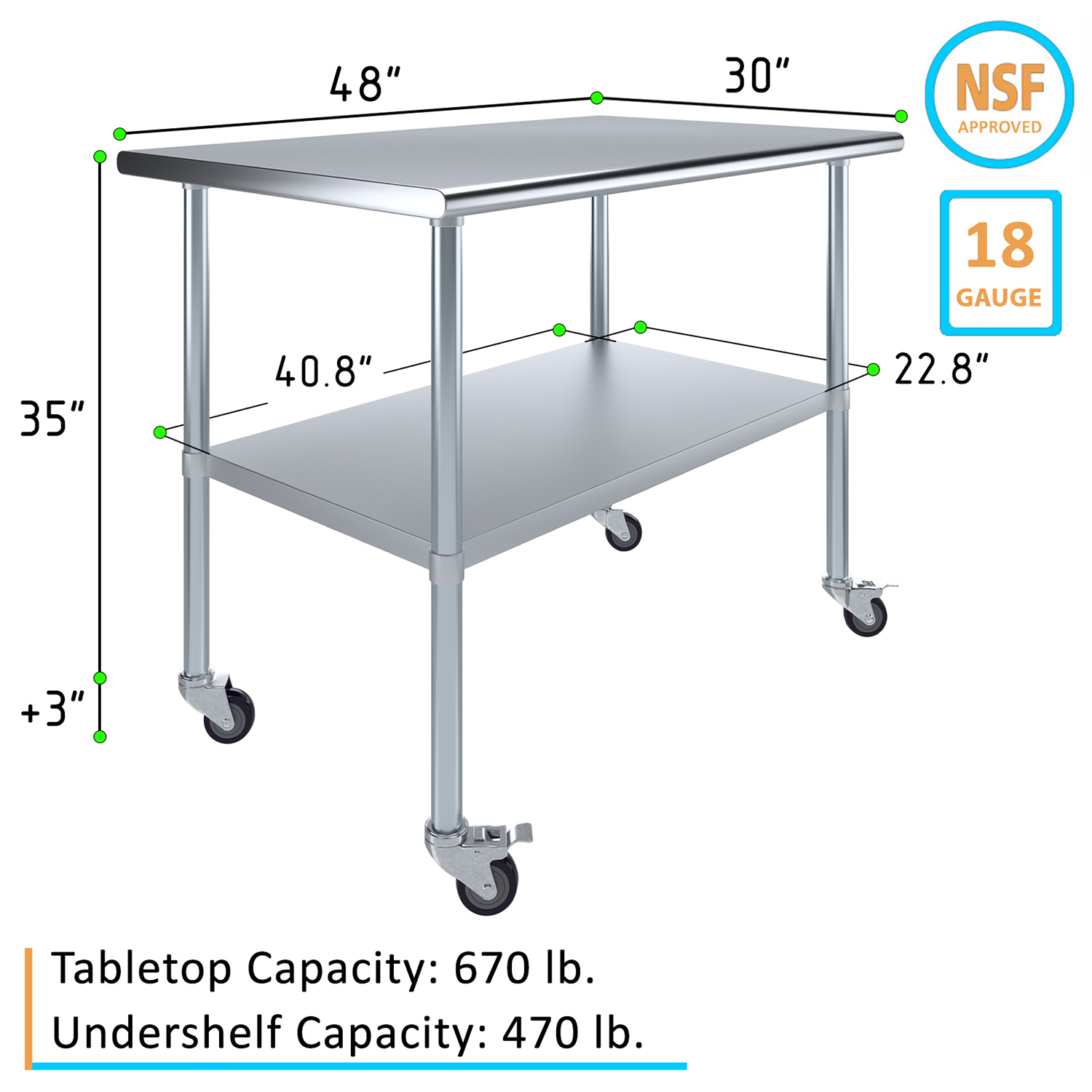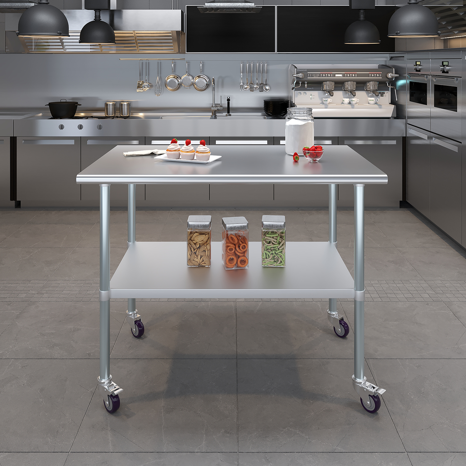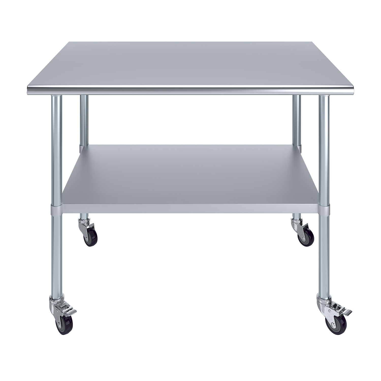 Optimize your workspace with the 30″ x 48″ Stainless Steel Work Table featuring an undershelf and a set of four wheels for enhanced mobility and storage. This work table is constructed from 18GA/430 stainless steel, ensuring a durable, easy-to-clean surface. Designed for demanding environments such as commercial kitchens, laboratories, and workshops, this table guarantees long-lasting performance and reliability.